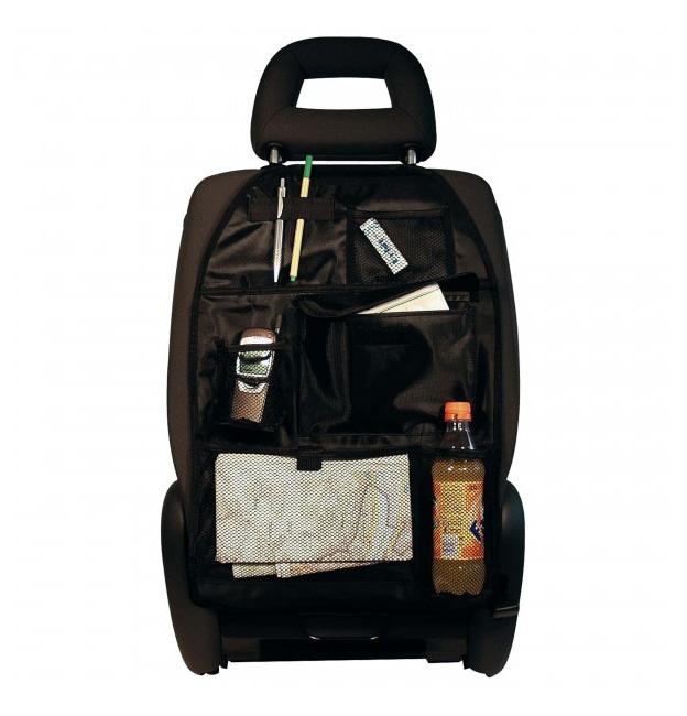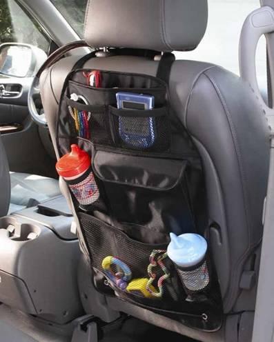 Tahle šikovná věcička je moc prima, hlavně když vozíte vzadu v autě děti, které pořád něco chtějí. Samozřejmě kouzlo tohoto kapsáře objeví i ti, kteří sice děti v autě nevozí, ale zato mají rádi v autě pořádek a vše na svém místě. Jednoduše připevněte tento kapsář na zadní stranu předního sedadla, upevněte horní část pomocí popruhů za opěrku hlavy a spodní části popruhů za sedadlo. Získáte tak kapsář se síťovanou kapsou na mapy, velkou kapsu uzavíratelnou na suchý zip, další síťovanou kapsu na drobnosti, přihrádku na časopisy, držák na tužky a kapsu na láhev s nápojem. Už nikdy se nebudete muset při jízdě otáčet, aby jste něco dětem podali, budou mít vše na dosah ruky přímo před očima. Navíc vám svýma botami neokopou a neponičí sedačku před sebou. Věci se nebudou v autě povalovat a vy budete mít uklizené a čisté auto.