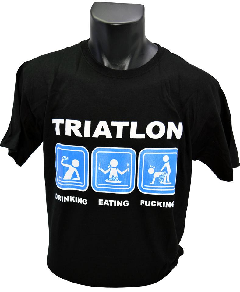 Tričko Triatlon je vhodné pro každodenní nošení do zaměstnání nebo za zábavou. Vtipné tričko je vyrobeno ze 100% bavlny a jeho velikost splňuje klasickou konfekci. Tričko Triatlon je dodáváno pouze v černé barvě.