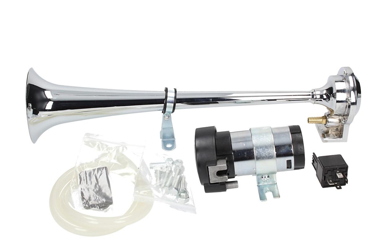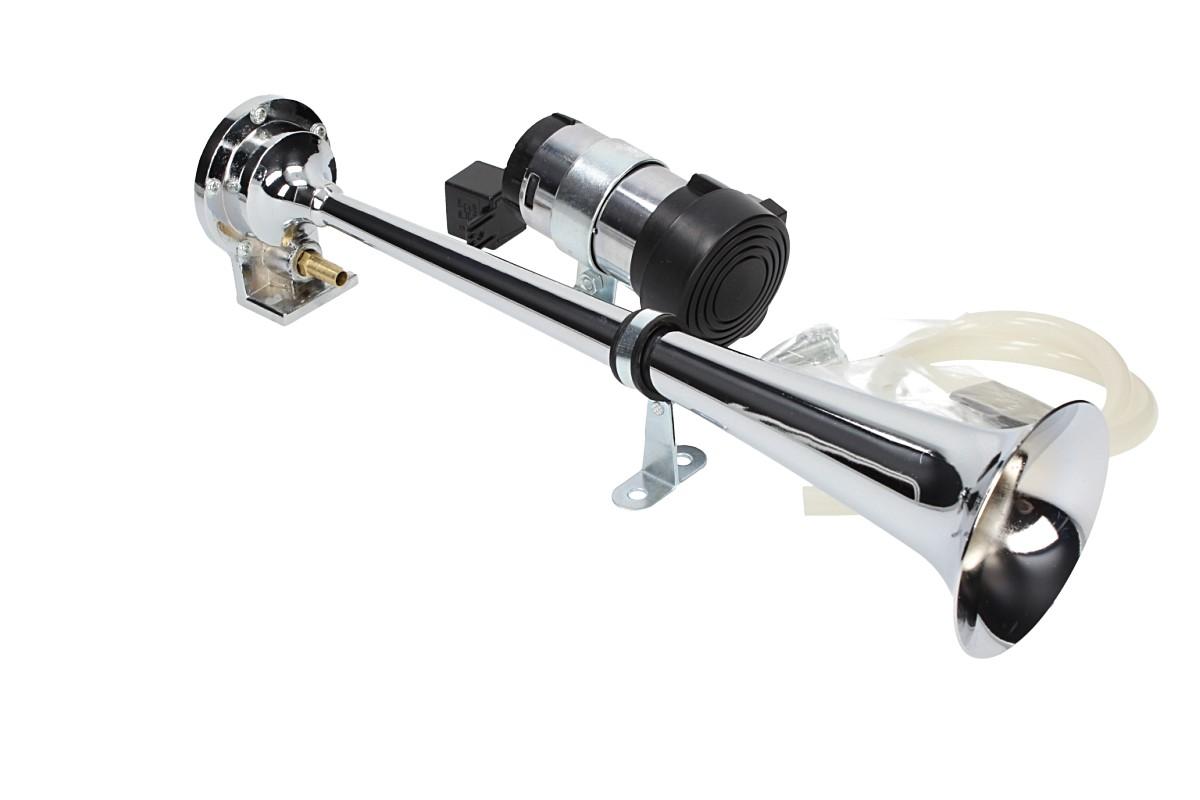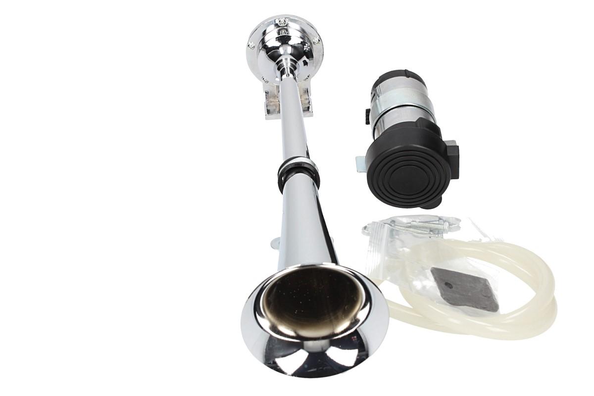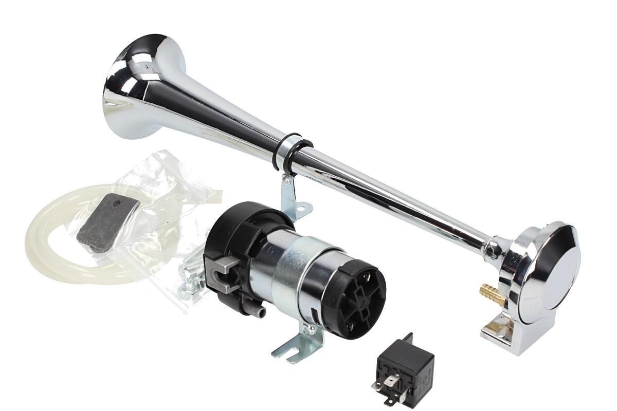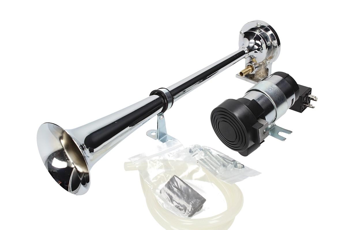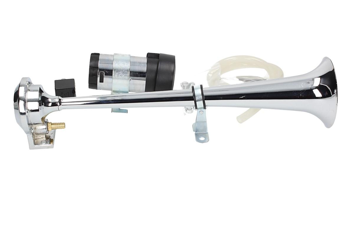 Elektrický klakson s kompresorem elektrický 12V vzduchový je velmi výkonný klakson v chromované úpravě vhodný do automobilu, nákladního vozu nebo na motocykl. Elektrický klakson s kompresorem vzduchový je vybaven spínacím relé, průhlednou vzduchovou hadicí, šrouby k přichycení a velkou troubou o délce 37 cm. Tento klakson vydává opravdu mohutný zvuk, díky kterému si Vás každý všimne.