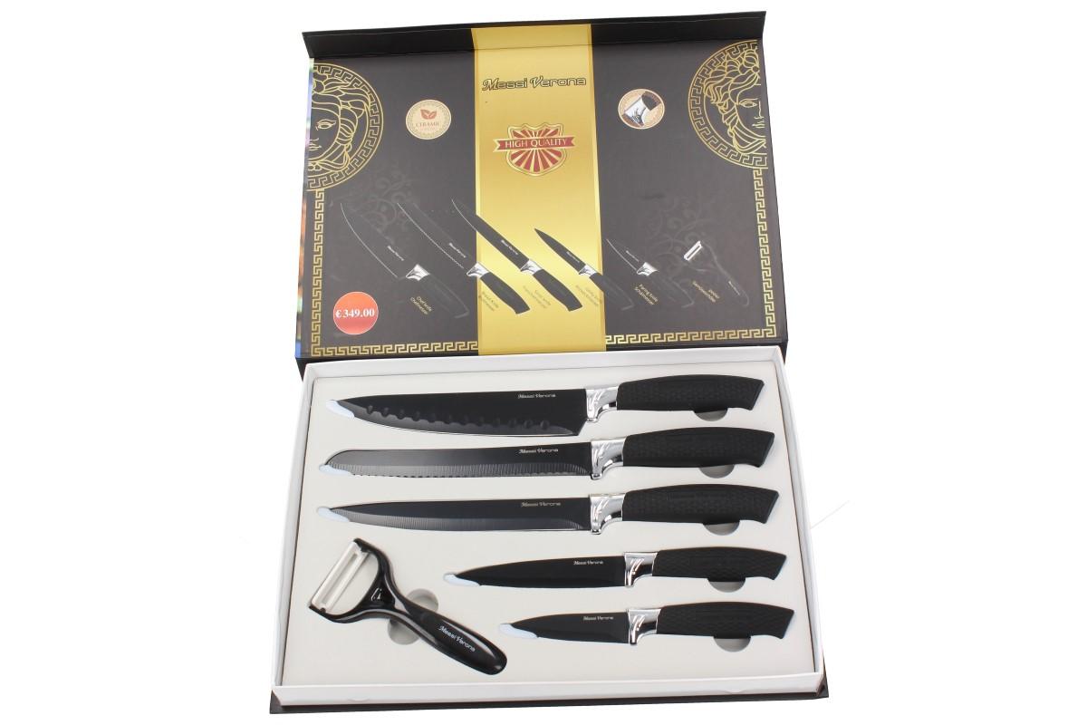 Sada 5ti nožů MESSI VERONA MV-005BLK je uložena v krásném dárkovém boxu včetně škrabky na brambory, zeleninu apod., kterou od nás dostanete ZDARMA!
