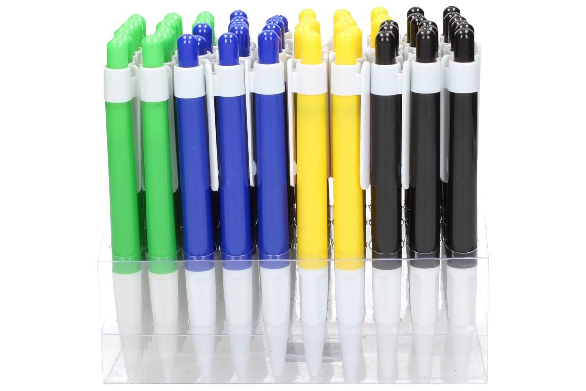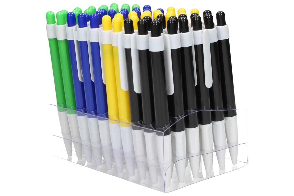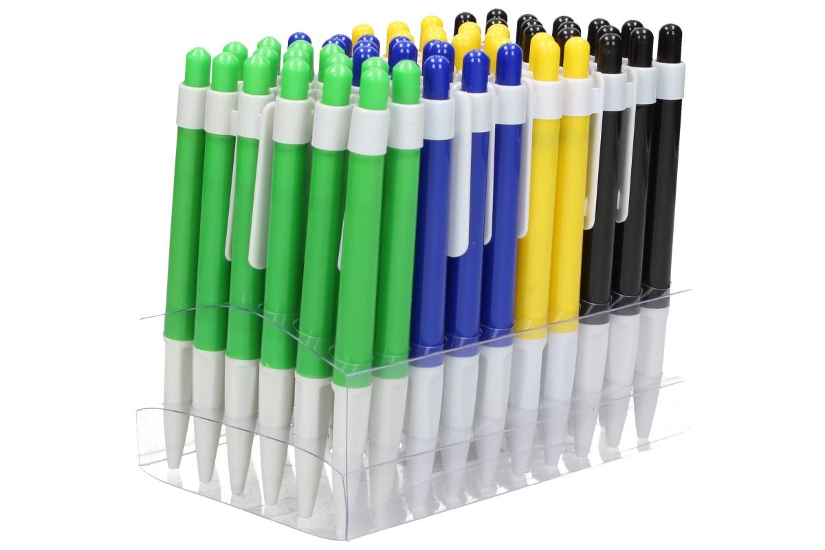 Kuličkové plastové propisky s modrým inkoustem dodáváme ve čtyřech různých barvách, zelená, modrá, černá a žlutá. Celoplastové propisky mají skosený a specielně upravený grip pro lepší úchop mezi prsty, bílý klip a cvakátko v barvě těla propisky.