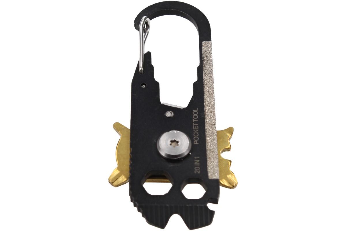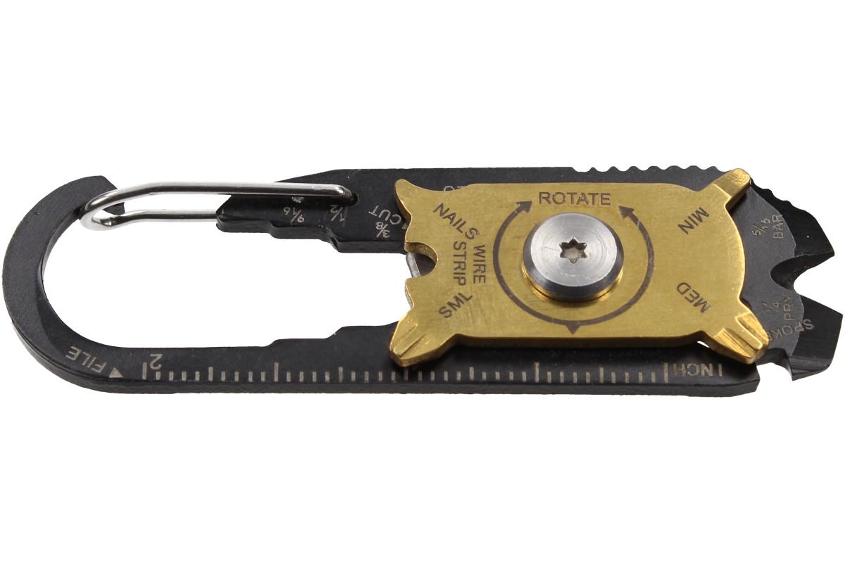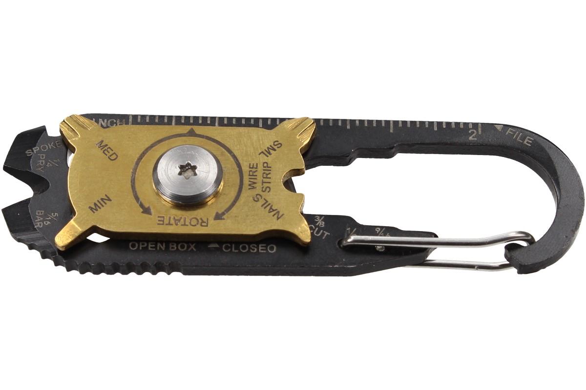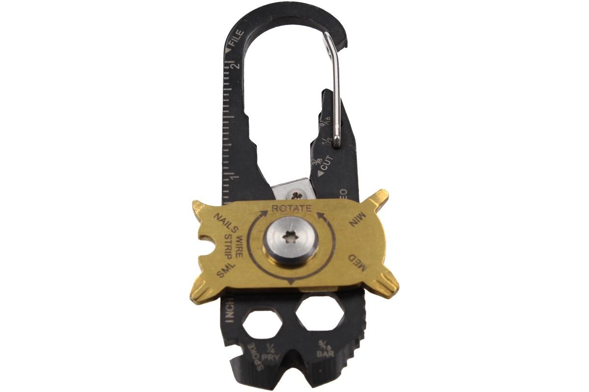 Tento, rozměry a váhou malý, pomocník je velký co se do funkčnosti týče. Umí měřit, brousit, pilovat, škrabat, povolovat šrouby a imbusy, řezat, stahovat izolaci z kabelů a mnoho dalšího. Ideální pro všechny řemeslníky a šikovné muže, kteří si dokáží poradit v každé situaci a nic je nezaskočí. To vše krásně zpracované v kvalitním kovu s karabinou jako přívěsek na klíče, poutko u kalhot či batohu.