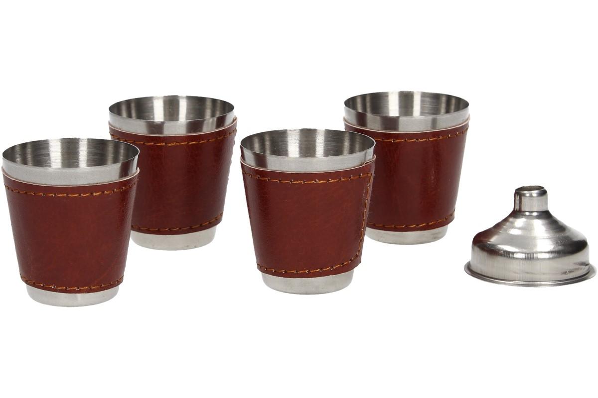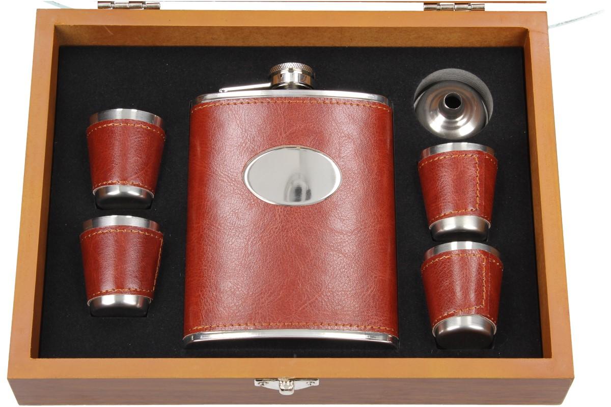- Materiál: krabička a figurky dřevo, placatka, nálevka a kalíšky nerezová ocel, placatka a kalíšky potaženy koženkou