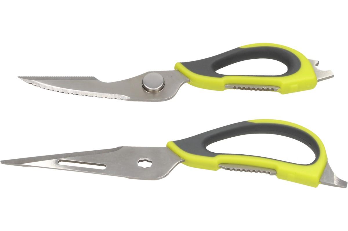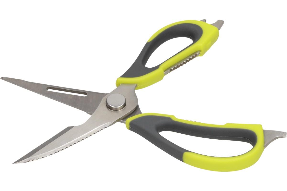 Nůžky víceúčelové poslouží v domácnosti, v kuchyni,... Mají mnoho funkcí - klasické nůžky, otvírák na korunkové uzávěry uzávěry, louskáček ořechů, po rozložení nůž se zubatým ostřím - pilka, nebo otvírač kartónů, šroubovák, nůžky na kuře, škrabka na zeleninu.