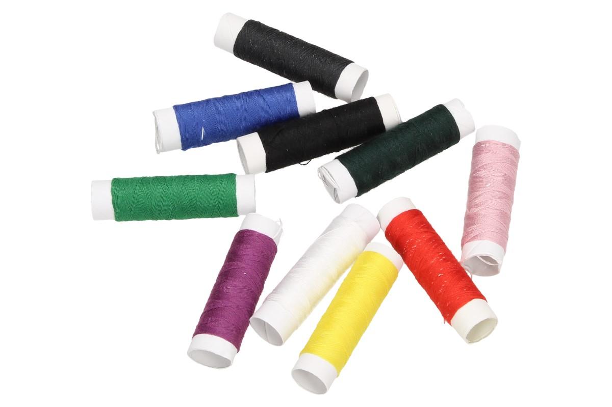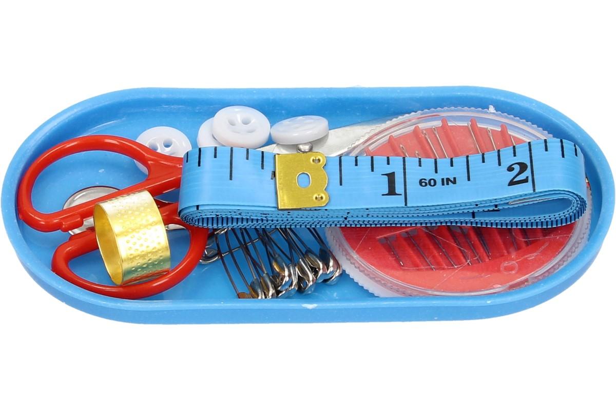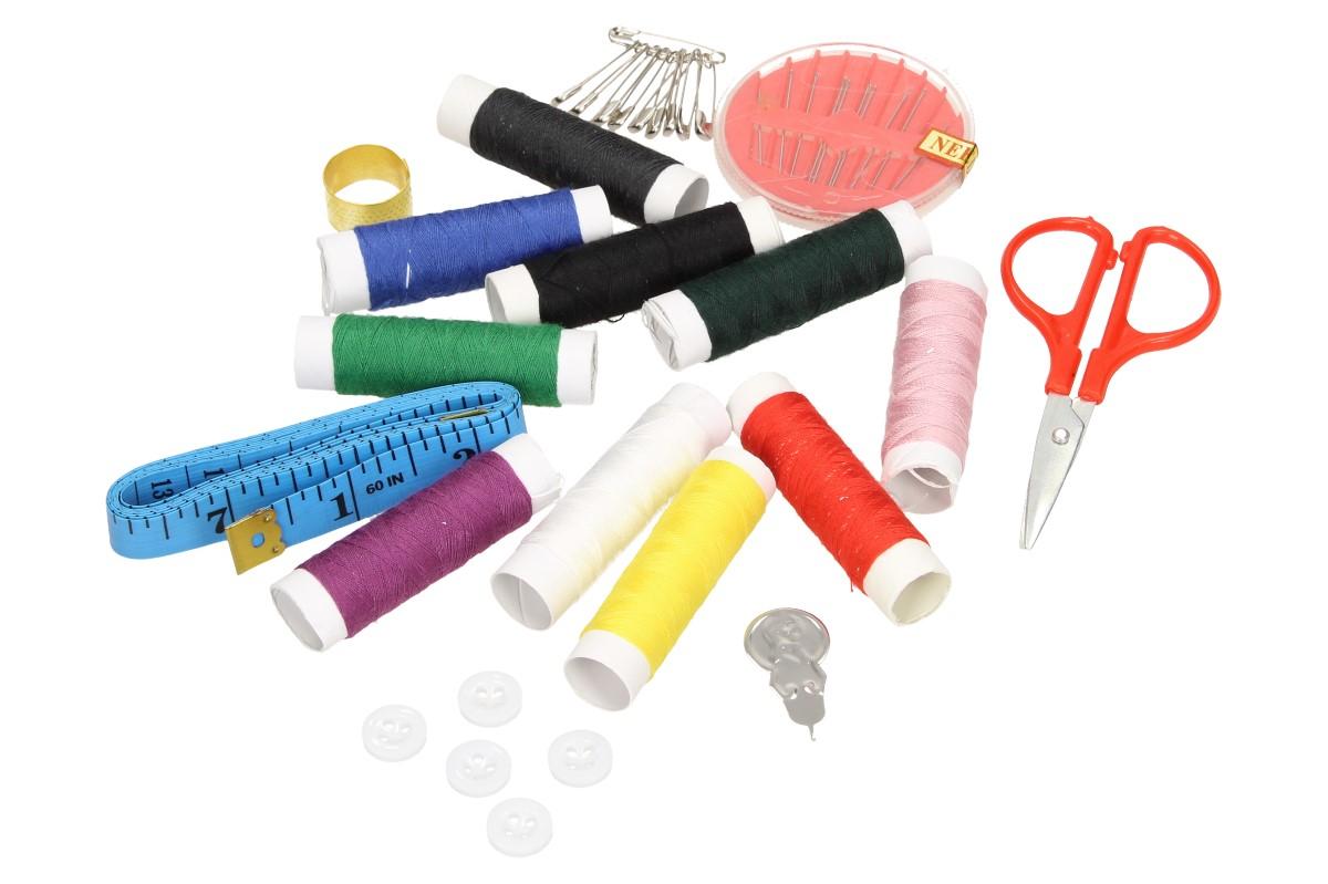 - Balení obsahuje: 10x jehla, 5x knoflík, 10x spínací špendlík, 1x malé nůžky, 1x 150 cm dlouhý metr, 1x kovový náprstek, 1x navlékač nití, 10x nit v různých barvách, 1x malý kufřík