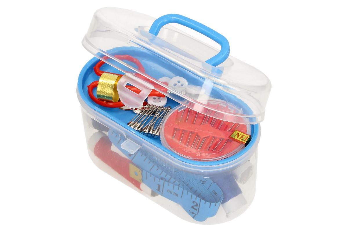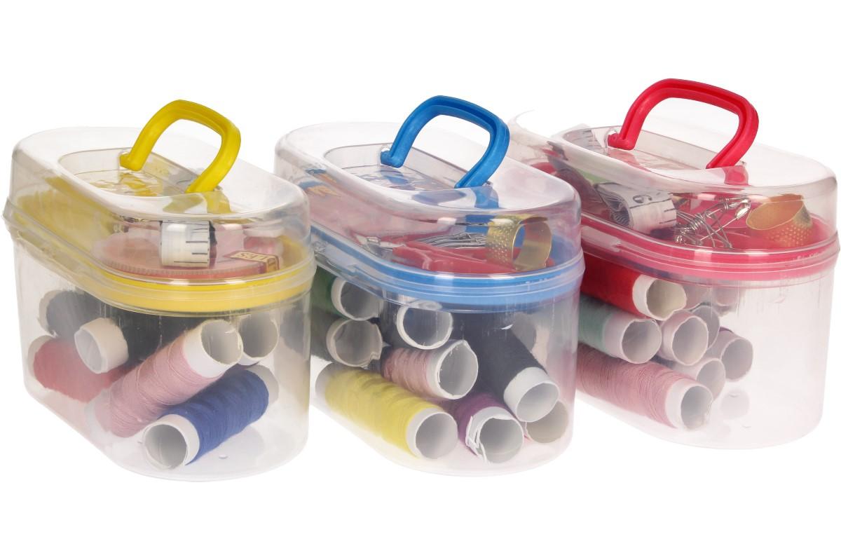 Kufřík šicí souprava je sada na šití v plastovém boxu s poutkem. Šicí souprava je velmi praktická a vhodná do každé domácnosti. Obsahuje všechny základní věci, které potřebujete k zádkladnímu šití nebo opravení vašeho oblečení. Box se skládá ze dvou částí - z kufříku a odnímatelného patra uvnitř. Dodáváno ve třech různých barvách: modrá, žlutá a červená.