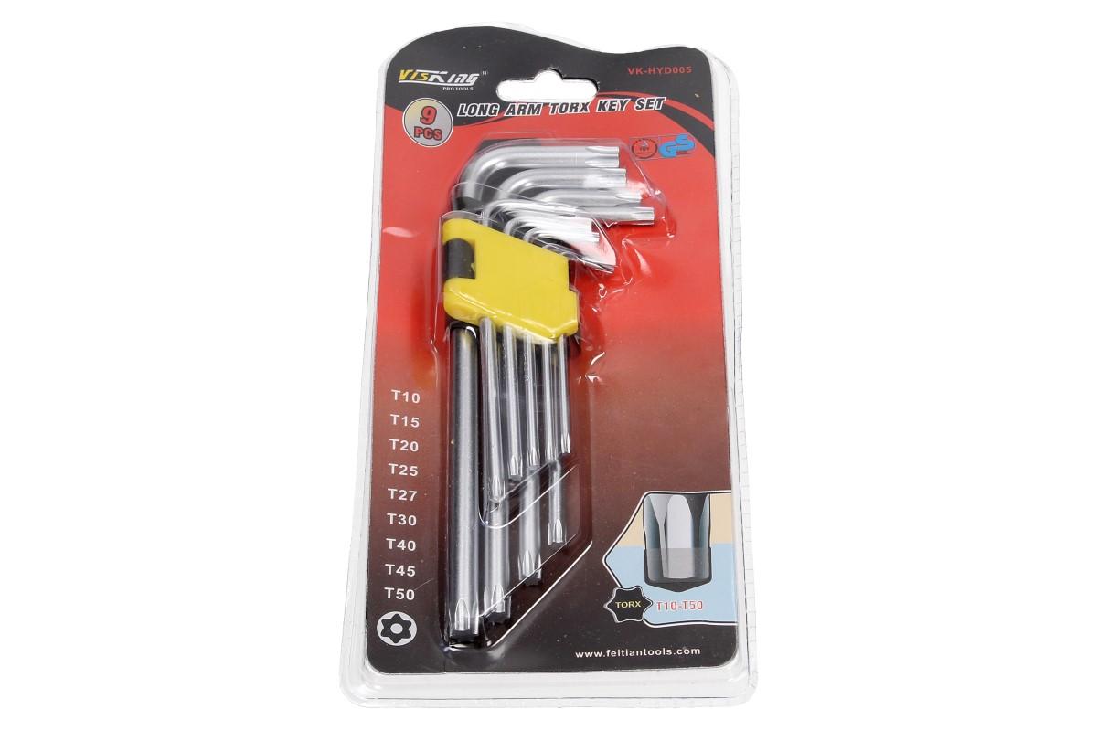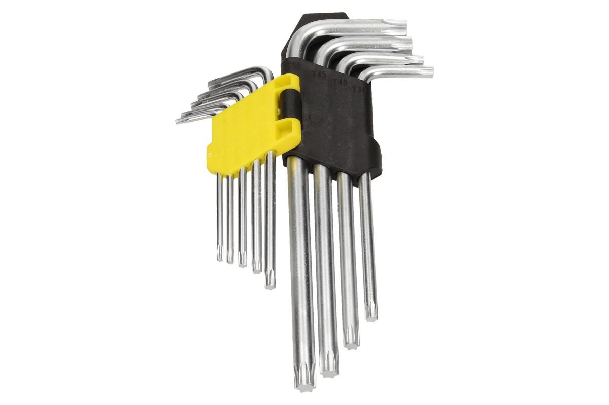 Sada klíčů hvězdička 9 kusů uspořádány v praktickém pořadači. Sada devíti klíčů torx v L profilu jsou seřazeny podle velikosti: T10; T15; T20; T25; T27; T30; T40; T45; T50. Klíče jsou vyrobeny z kvalitní, nerezové oceli a mají dlouhou životnost. Dodáváno ve stříbrné barvě. Sada je vhodná do každé dílny i garáže.