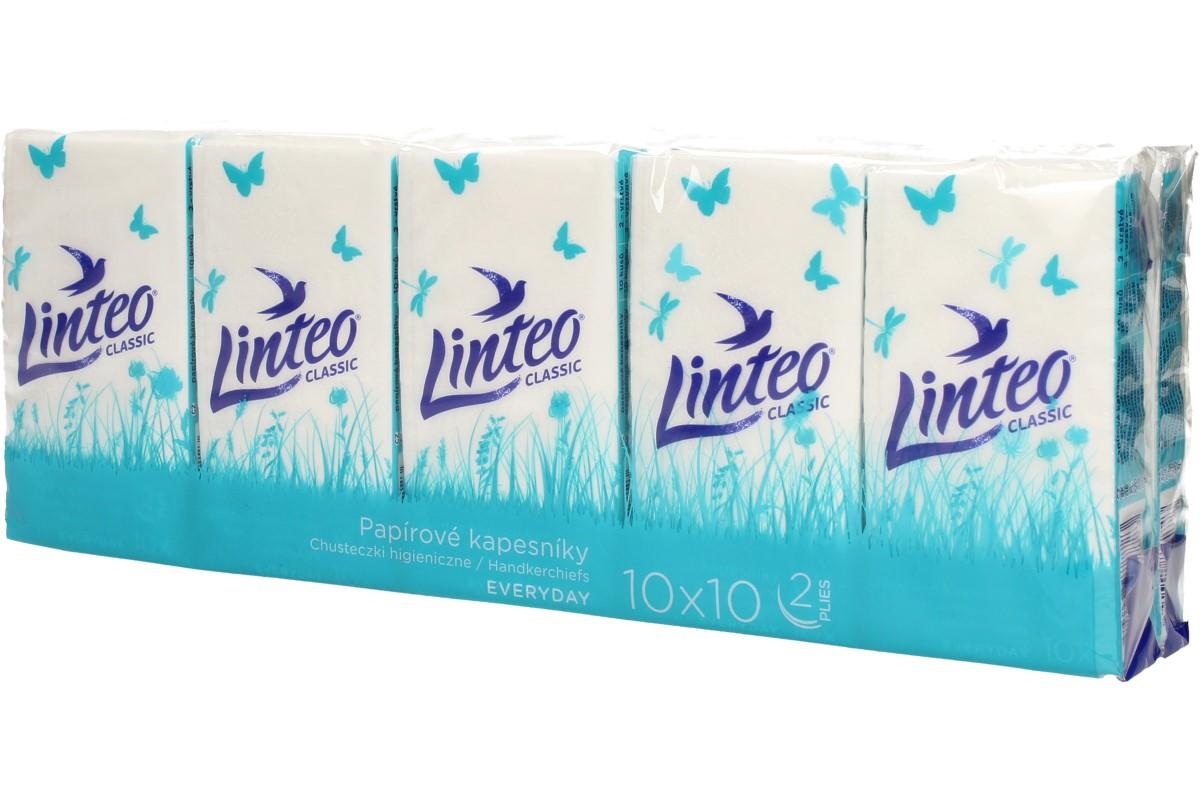 Papírové kapesníky Linteo 2vrstvé 10x10 zaručí vysokou jemnost, měkkost a pevnost. V období chřipek, rýmy a alergií je vždy vhodné mít po ruce kapesníčky, které vám nepodráždí a neodřou nos. Balení obsahuje 10 balíčků po 10 kapesnících, které jsou vyrobeny ze 100% celulózy a jsou neparfémované.