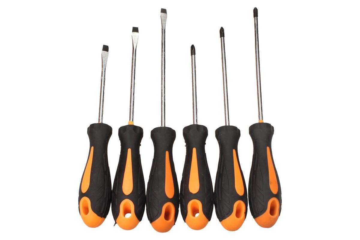 Sada šroubováků 6 kusů se bude vyjímat v každé dílně, autoservisu nebo garáži každého kutila. Šroubováky mají ergonomicky tvarované gumové rukojeti s protiskluzovou úpravou pro pohodlný a bezpečný úchop. Dříky jsou vyrobeny z chrom-vanadové oceli a každý šroubovák má černý tvrzený magnetický hrot. Zaoblený konec rukojeti umožňuje rychlé protáčení v dlani.
