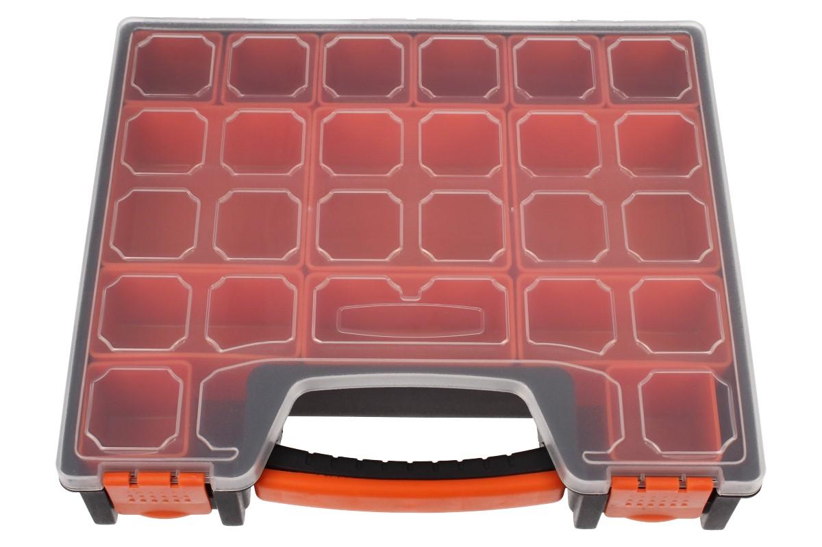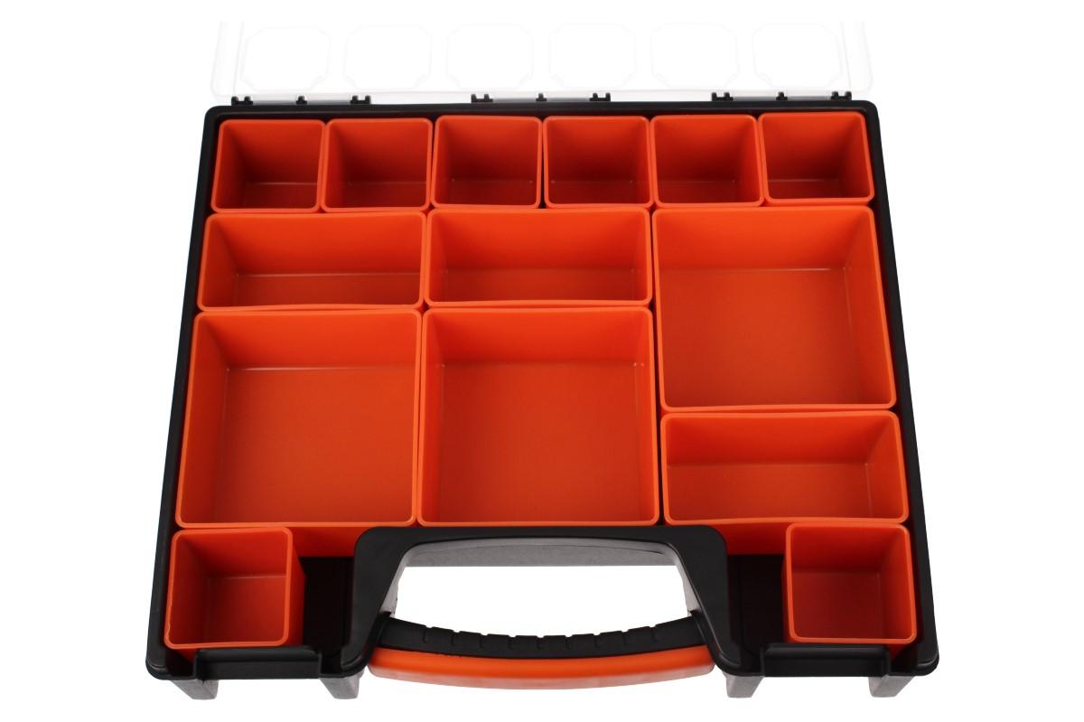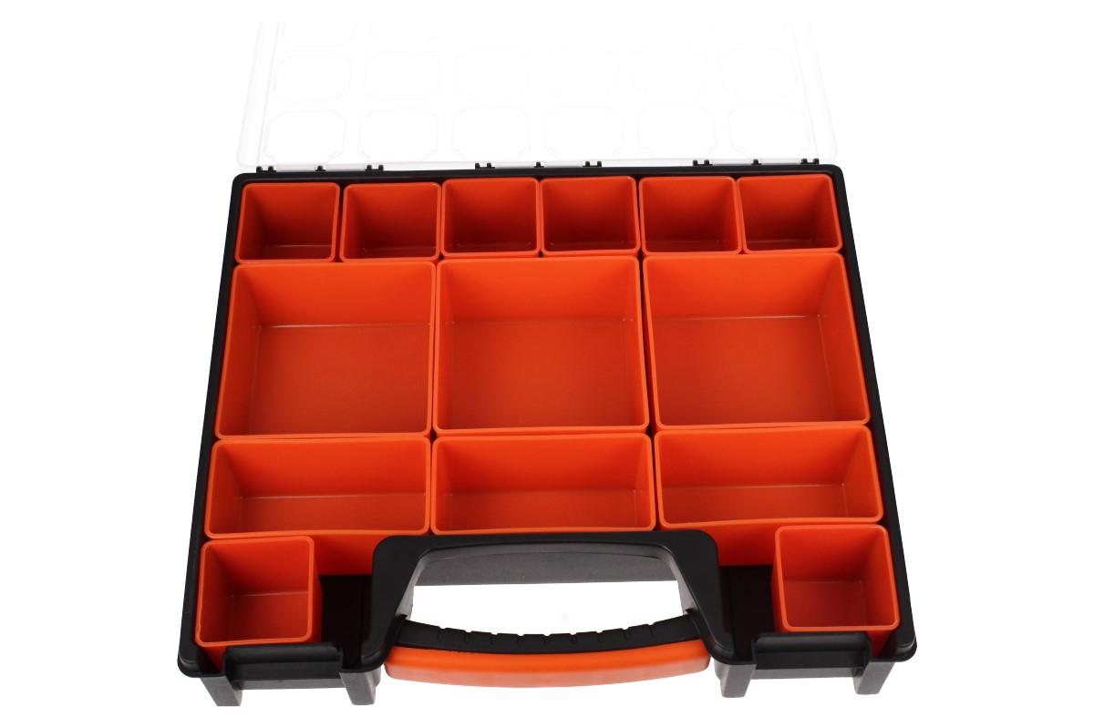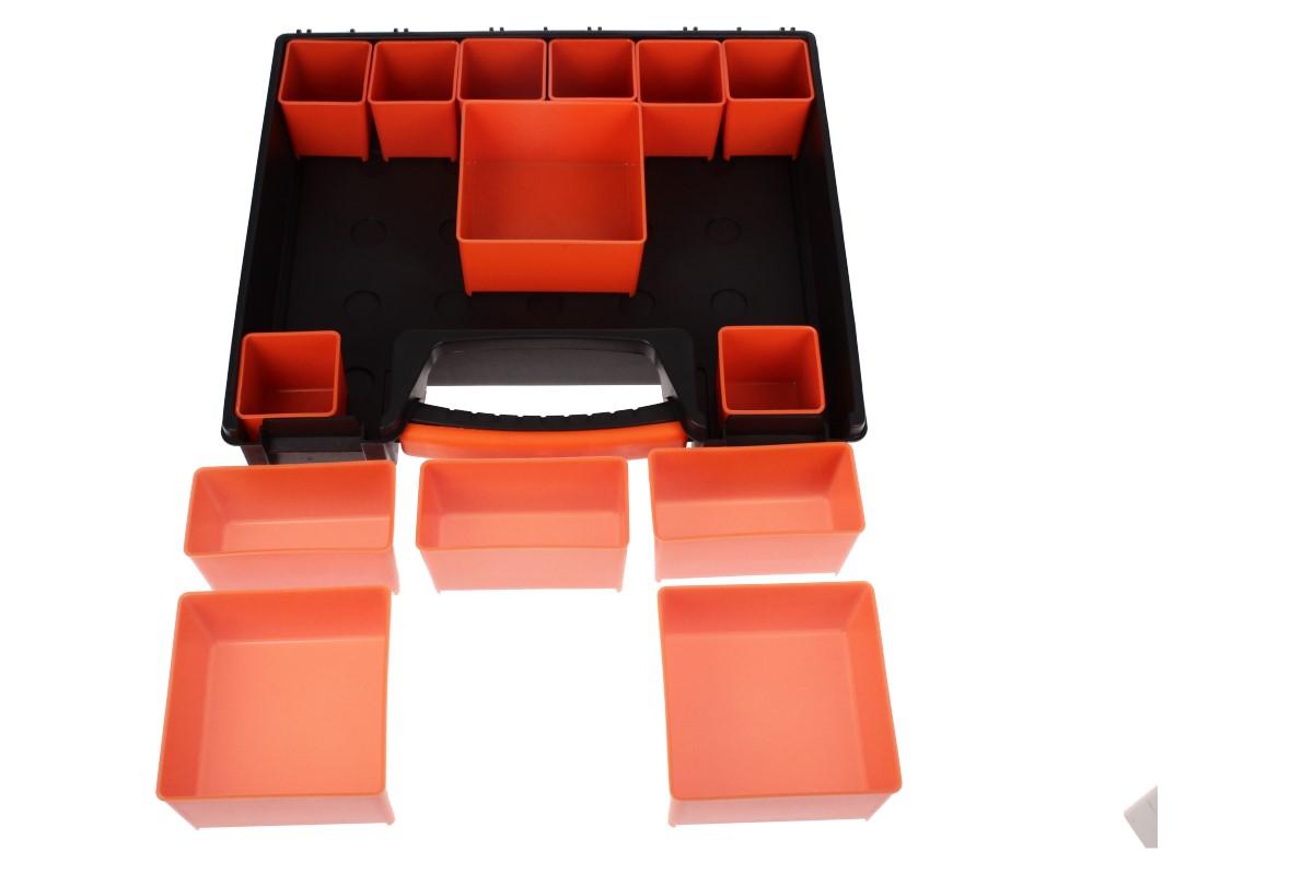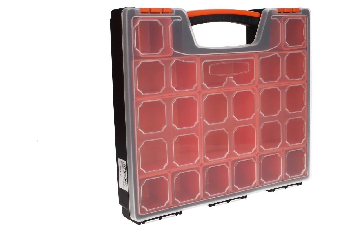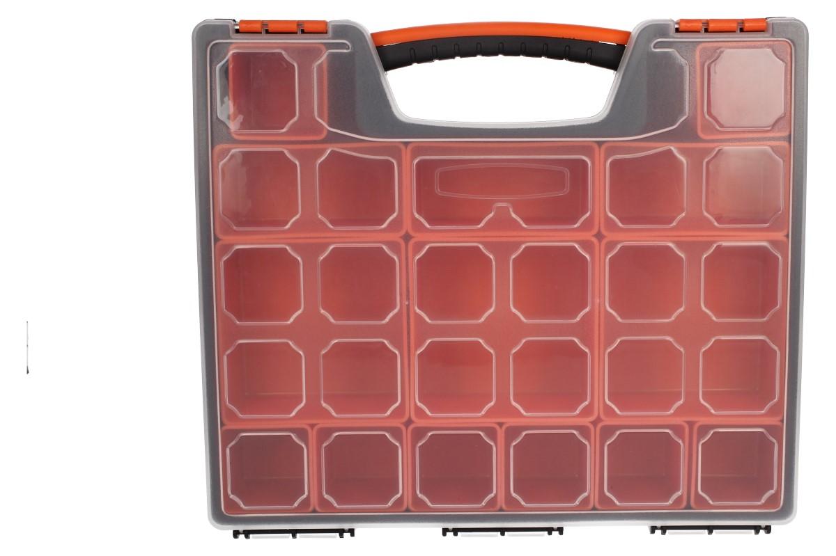 Univerzální kufřík s pořadníky: Potřebujete si seřadit vaše rybářské potřeby? Vaše šroubky a matice v dílně? Udělat si kompaktní lékarničku? Náš kufřík z pevného ABS plastu je ideální řešení. Má rozměry 30 x 26 x6 cm, průhledné víko a fixovatelné panty, které se vám samovolně neotevřou. Kufřík má celkem 14 různě veůkých pořadníků "hlubokých vaniček", které jsou libovolně seřaditelné a mají protiskluzové dno.