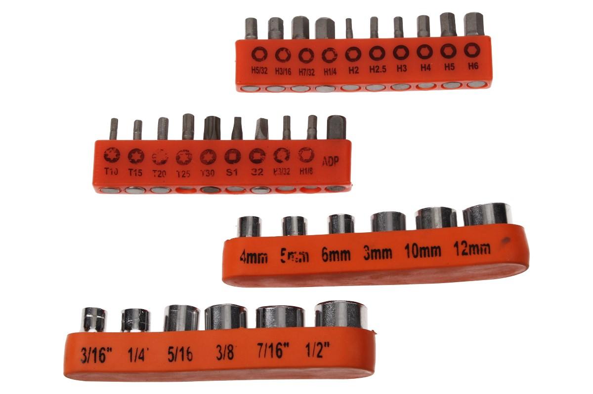 Multifunkční šroubovák s 43 bity je perfektní multifunkční výbava do vaší dílny, do auta pro případ nouze, nebo na stavění nábytku pokud se nechcete zaobírat jednorázovými nástroji. Sada obsahuje šestihranné oříšky 4-12mm ale i americké 3/16" - 1/2". Hvezdičky t10-t30, imbus h2-h6, čtverce S1 a S2, dva ploché bity a tři křížové. Samotný šroubovák má kvalitně pogumovanou rukojeť a skvělý ohýbatelný nástavec, který vám zajistí přístup kamkoliv. Bity dodávané v gumových pouzdrech.