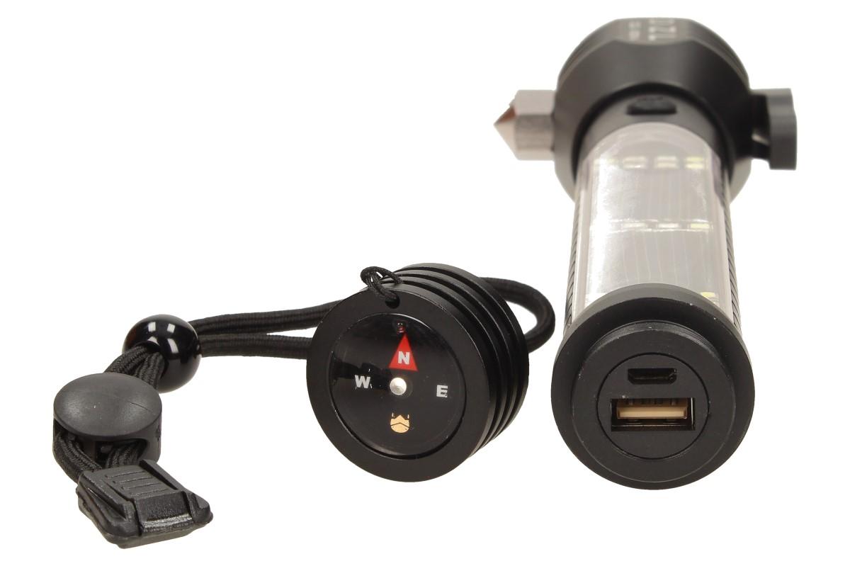 Tuto multifunkční solární baterku s kompasem určitě ocení každý řidič auta, autobusu, tramvaje, metra ale i ten, kdo tráví v přírodě spoustu času. S touto super baterkou lze v nouzi snadno rozbít okýnko i přeříznout bezpečnostní pás. Baterka je opatřena různými druhy a směry svícení led světla. Jedno standadní kulaté bílé na kourně a jedno boční červené výstražně blikající, nebo klasické bílé jsou vždy dobrým a nepostradatelným pomocníkem v nečekaných situacích. Silný magnet slouží jak pro pevné uchycení baterky, tak zároveň i v případě, že magnetem potřebujete vytáhnout zapadlý rukou nedostupný kovový předmět. Napájena je přes USB kabel nebo pomocí solárního panelu. Na zadní části baterky naleznete také kompas. Ideální jako součást povinného vybavení vozidla. Své využití najde ale i v dílně, garáži, v domácnosti či při kempování.