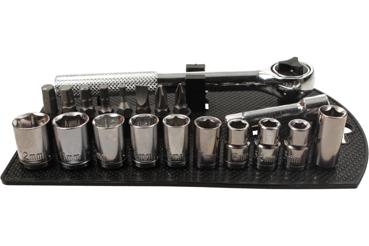 Sada bitů s ráčnovým klíčem 20 ks SDY-94143 je perfektní multifunkční výbava do vaší dílny, do auta pro případ nouze, nebo na stavění nábytku pokud se nechcete zaobírat jednorázovými nástroji. Sada obsahuje 6hranné hlavice 5; 5,5; 6; 7; 8; 9; 10; 11; 12 ; mm, phillips: Ph 1; Ph 2;, imbus h3 - h6 a jeden plochý 6 mm Samotný klíč má kvalitně zpracovanou rukojeť a ráčnovou hlavu otočnou o 360°. Sada je dodávaná na plastovém držáku se zabudovanými magety. Celou tuto destičku si můžete pověsit díky otvoru který má.