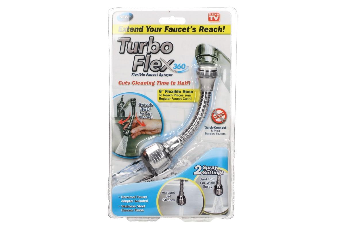 Spořič vody s nerezovým prodloužením Turbo Flex lze snadno a rychle připojit k většině baterií. 15 cm dlouhá hadice je vyrobena z nerezové oceli a můžete s ní otáčet o 360 °. Turbo Flex nabízí dva proudy vody. Povytažením nahoru získáte bohatě provzdušněný proud, zatažením dolů jemnou sprchu. Vnitřní sítko lze jednoduše vyčistit od nečistot, které se zde usadí. Skvělé pro oplachování ovoce a zeleniny, plnění vysokých váz, šamponování vlasů, koupání domácích mazlíčků a mnoho dalšího!