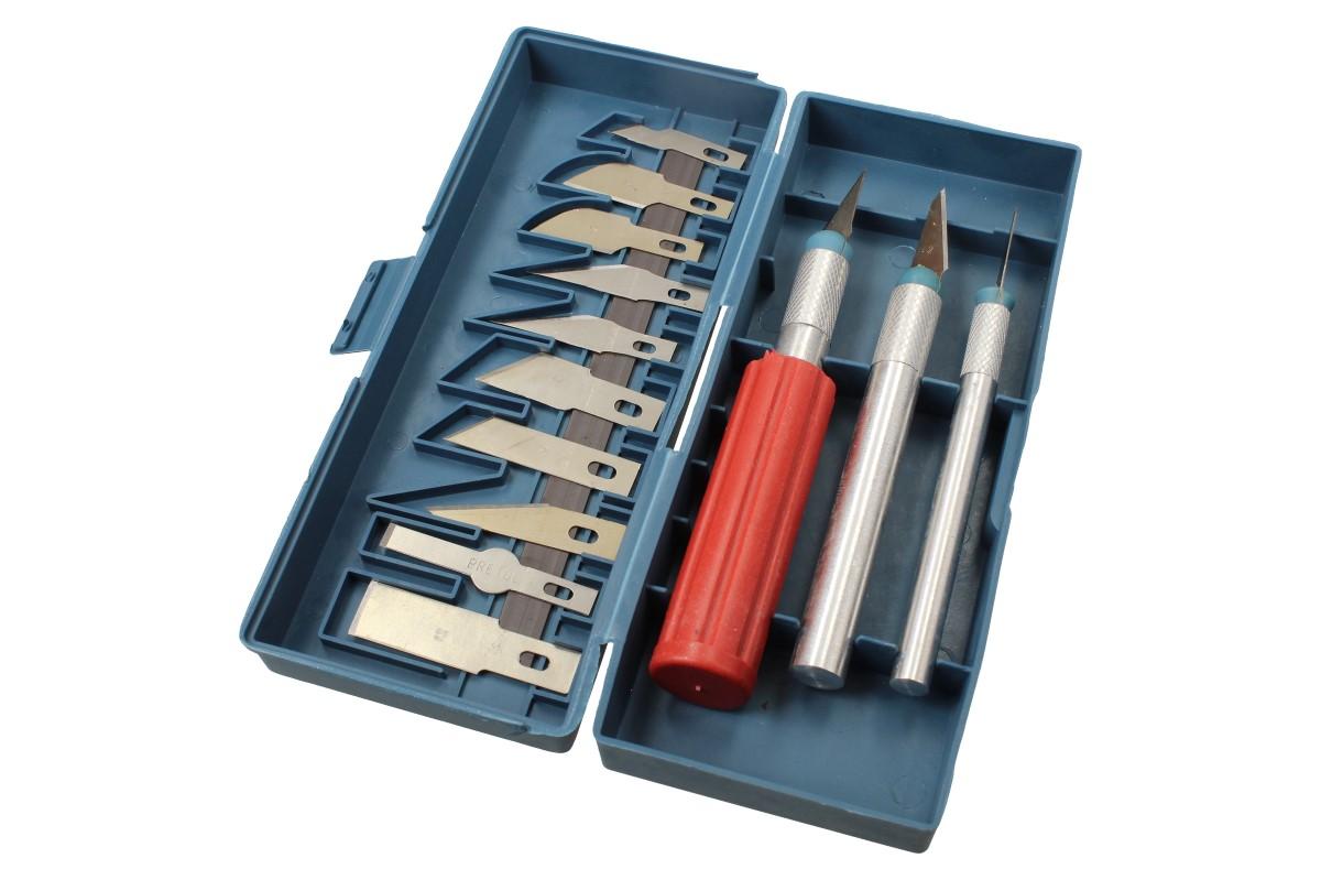 S vyřezávání či ořezávání různých materiálů, vám může pomocí tato sada vyřezávacích nožů. Nože jsou dodávány v plastové ABS krabičce, kterou lze zavřít. Balení obsahuje 13 různě tvarovaných čepelí, které jsou upevněny na magnetické liště a 3 držáky různé velikosti. Vyberte si nůž s požadovaným hrotem, upevněte jej na držadlo a můžete začít s prací.