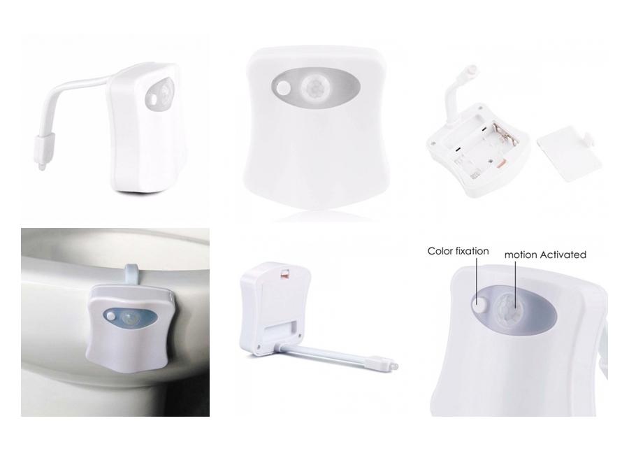 Toto toaletní LED světlo je navrženo s měkkým a pružným hrdlem z PVC, které lze snadno ohnout tak, aby vyhovovalo jakémukoli typu toalety, bez ohledu na tvar záchodové mísy. Pohybově aktivovaný LED senzor, se zapne pouze, když vstoupíte do koupelny ve tmě. Díky sanitárnímu designu se světlo snadno čistí. Odolné vůči vodě a lze jej čistit pomocí většiny čističů pro domácnost. může vybrat mezi 8 jednotlivými barvami, a po odchodu z toalety zůstane na chvíli zapnutá, aby vám pomohla najít cestu zpět. Napájeno 3x AAA bateriemi, které nejsou součástí.