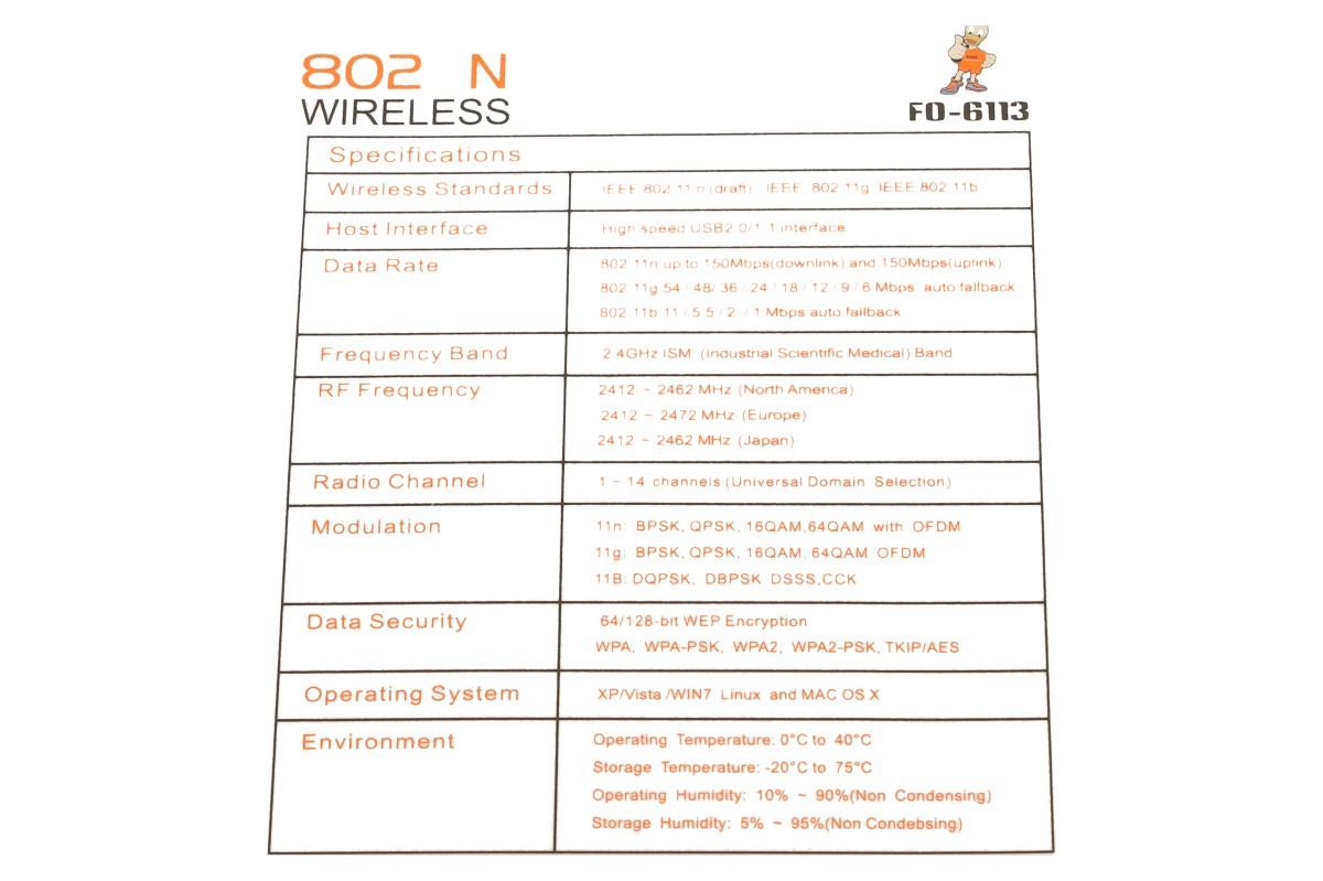 Bezdrátový wifi USB adaptér FO-6113 specifikace: