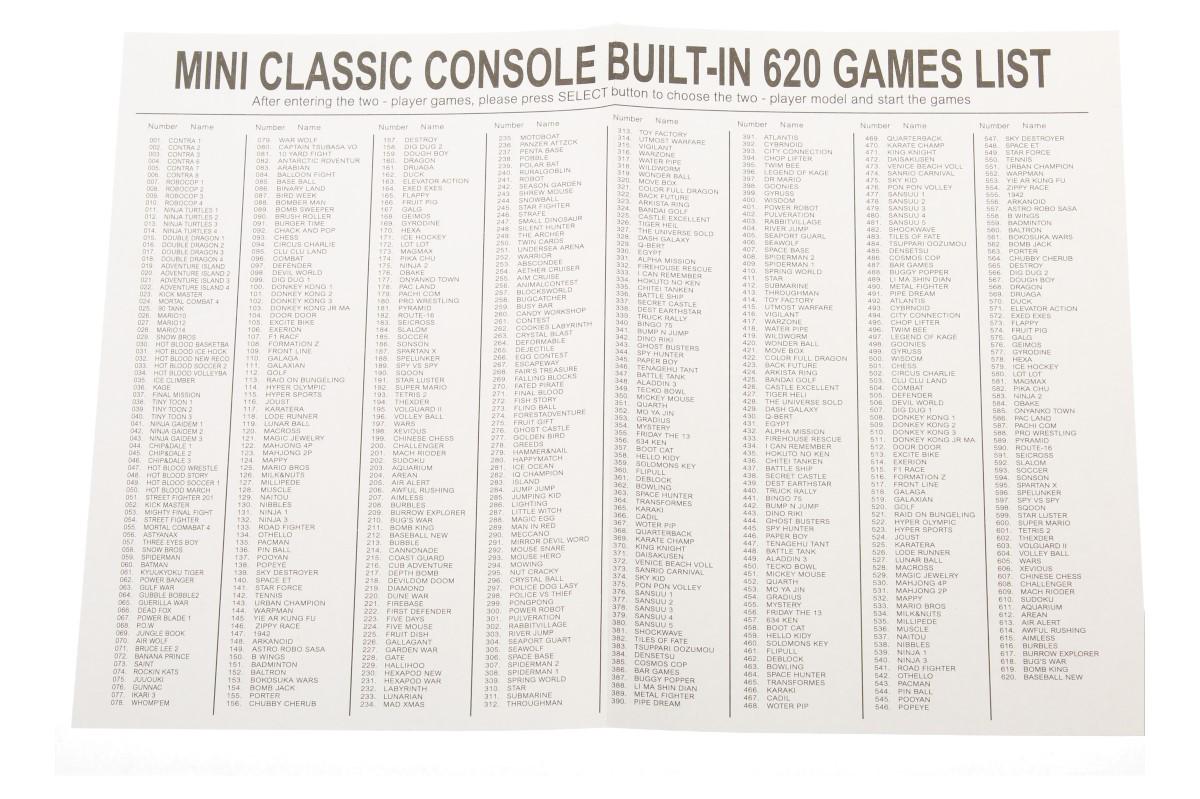 Retro herní konzole 620 vás vrátí zpět do vašeho dětství! Kdo by si nechtěl znovu zahrát věčného Super Maria, Pac-Mana, Zeldu nebo souboje Mortal Kombat. Nyní můžete znovu prožít zážitek ze hry a virtuálního světa, dokonce můžete ukázat svému dítěti, jak jste kdysi trávil svůj volný čas. V konzoli je 620 naistalovaných her, takže nemusíte používat různé kazety ani jiné doplňky. Stačí si vybrat Vaši oblíbenou hru a zábava může začít. Ke hře patří 2 ovladače. V balení také naleznete AV kabel, který obsahuje dvě připojení zvuku a jedno připojení videa, což může vyžadovat určité znalosti v závislosti na vašem televizoru. K televizi či monitoru lze připojit RCA kabelem. Její předností před starými modely je, že její rozměr je maličký, čili se skoro všude vejde.