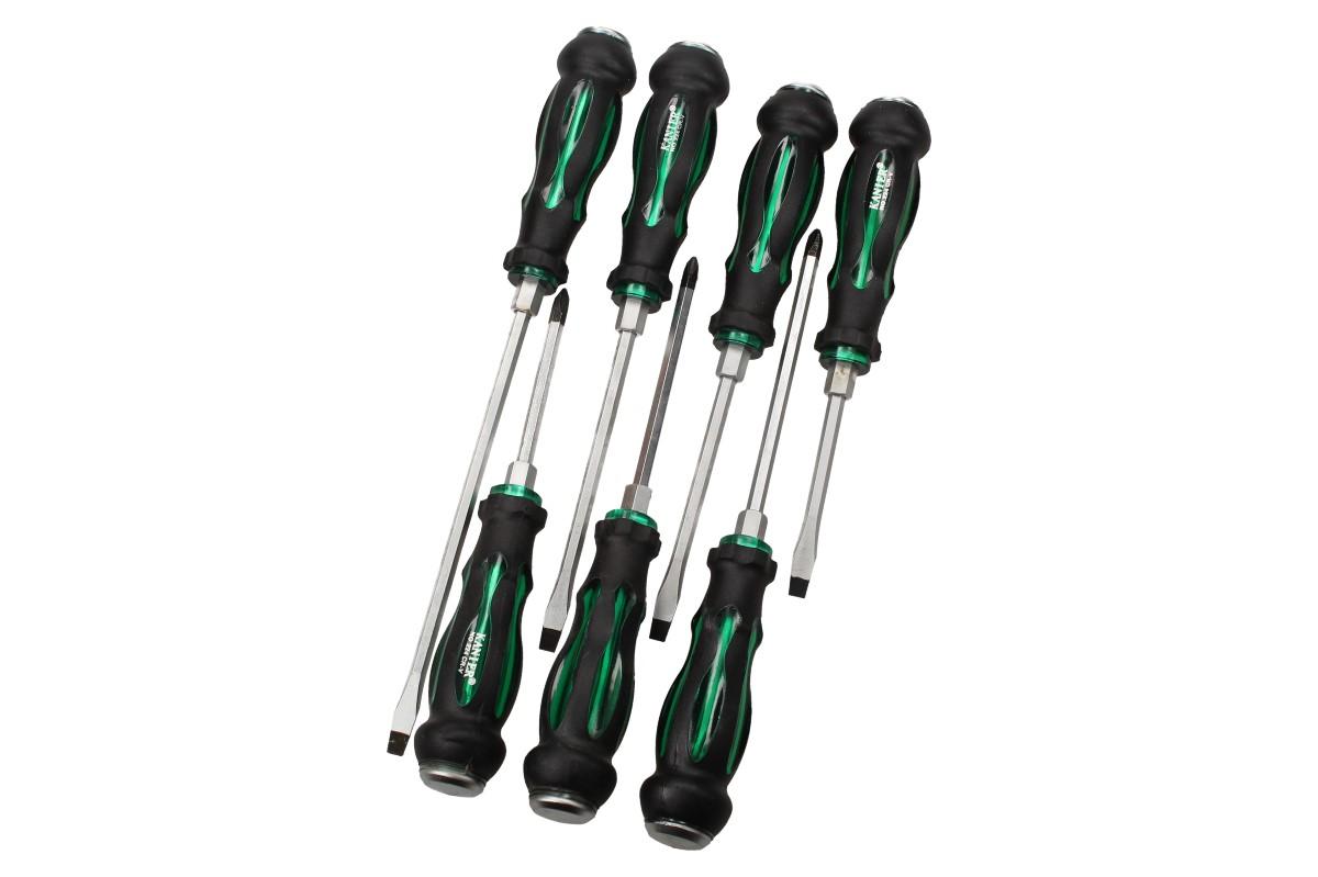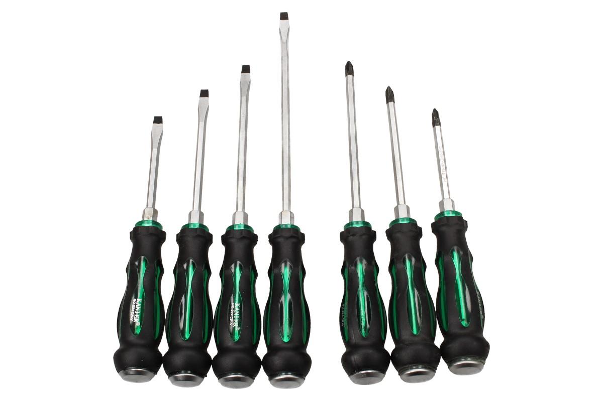 Tato sada šroubováků v látkovém obalu nesmí chybět v žádné dílně, autoservisu nebo garáži každého kutila. Šroubováky jsou seřazeny podle velikosti - 3x křížový a 4x plochý. Látkové pozdro umožňuje instalaci pomocí hřebíků na zeď. Šroubováky mají pogumovanou plastovou rukojeť s pevnou ocelovou patkou na konci v případě potřeby něco odseknout jako sekáčem. Šroubováký jsou vyrobeny z chrom-vanadové oceli a každý šroubovák má černý tvrzený magnetický hrot. Zaoblený konec rukojeti umožňuje rychlé ale pevné protáčení v dlani.