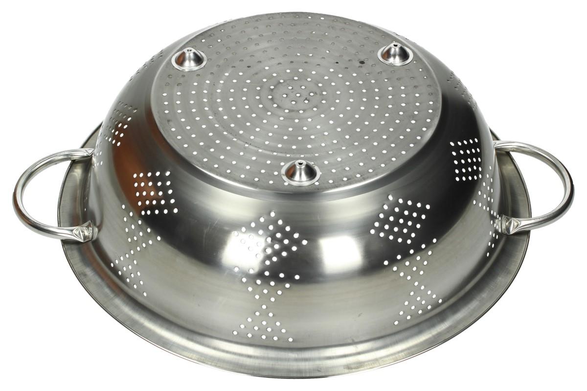 Nerezový cedník s oušky 34 cm by neměla postrádat žádná hospodyňe, ani správně vybavená závodní kuchyň. Využijete ho především při přípravě většího množství jídla např. na oslavu, svatbu, firemní akci, atd. Cedník je vyroben z kvalitního odolného nerezu, který je určený pro styk s potravinami. Je opatřen dvěma praktickými oušky a třemi nožkami, aby se během procesu cedění nepřevrátil. Vhodné na těstoviny, vařenou zeleninu, knedlíky, brambory a mnoho dalšího. Cedník je lehký, skladný a snadno se čistí.