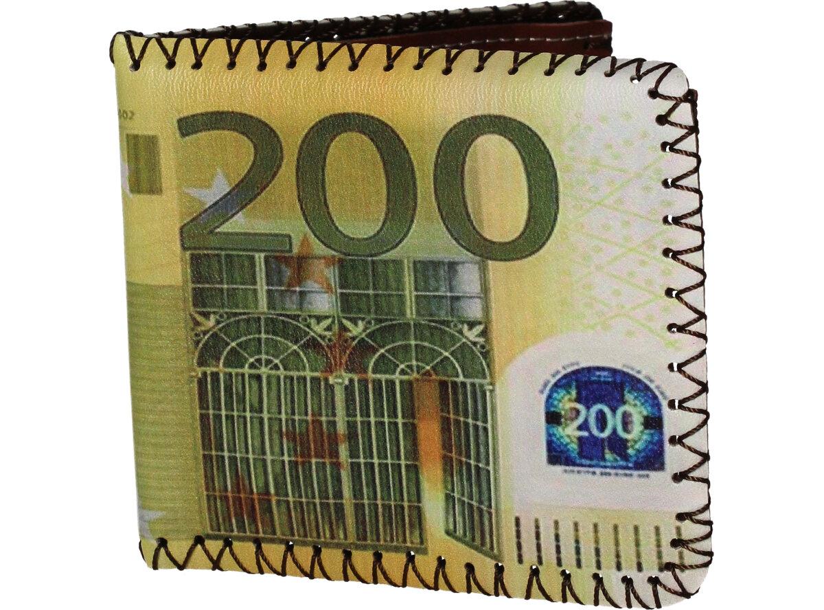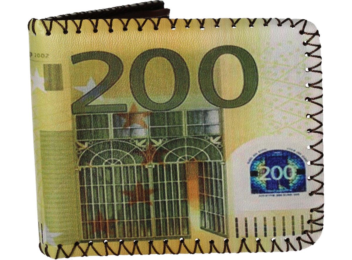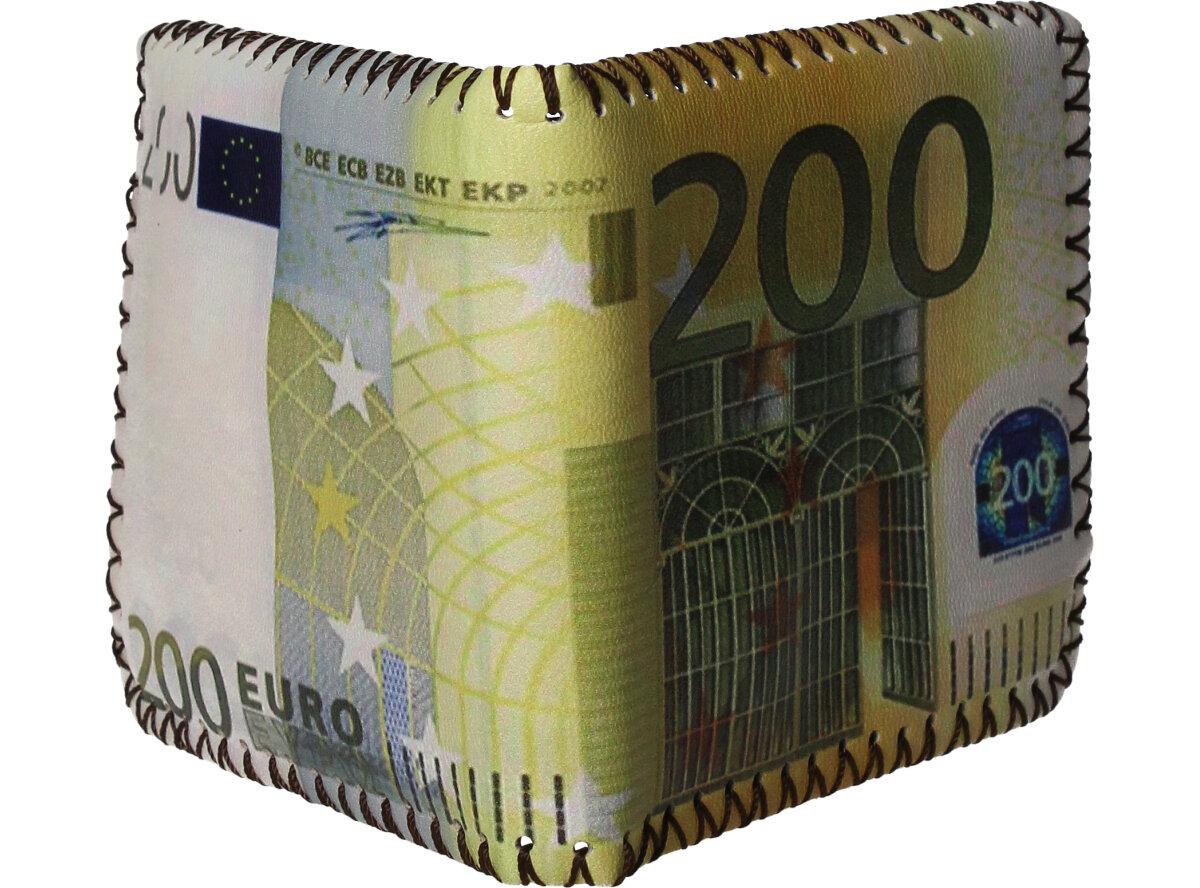 Dobrá peněženka za málo peněz s motivem 200 EUR bankovky, nejen na papírová platidla. Disponuje přihrádkami na kreditní karty, občanku, řidičský průkaz a další.