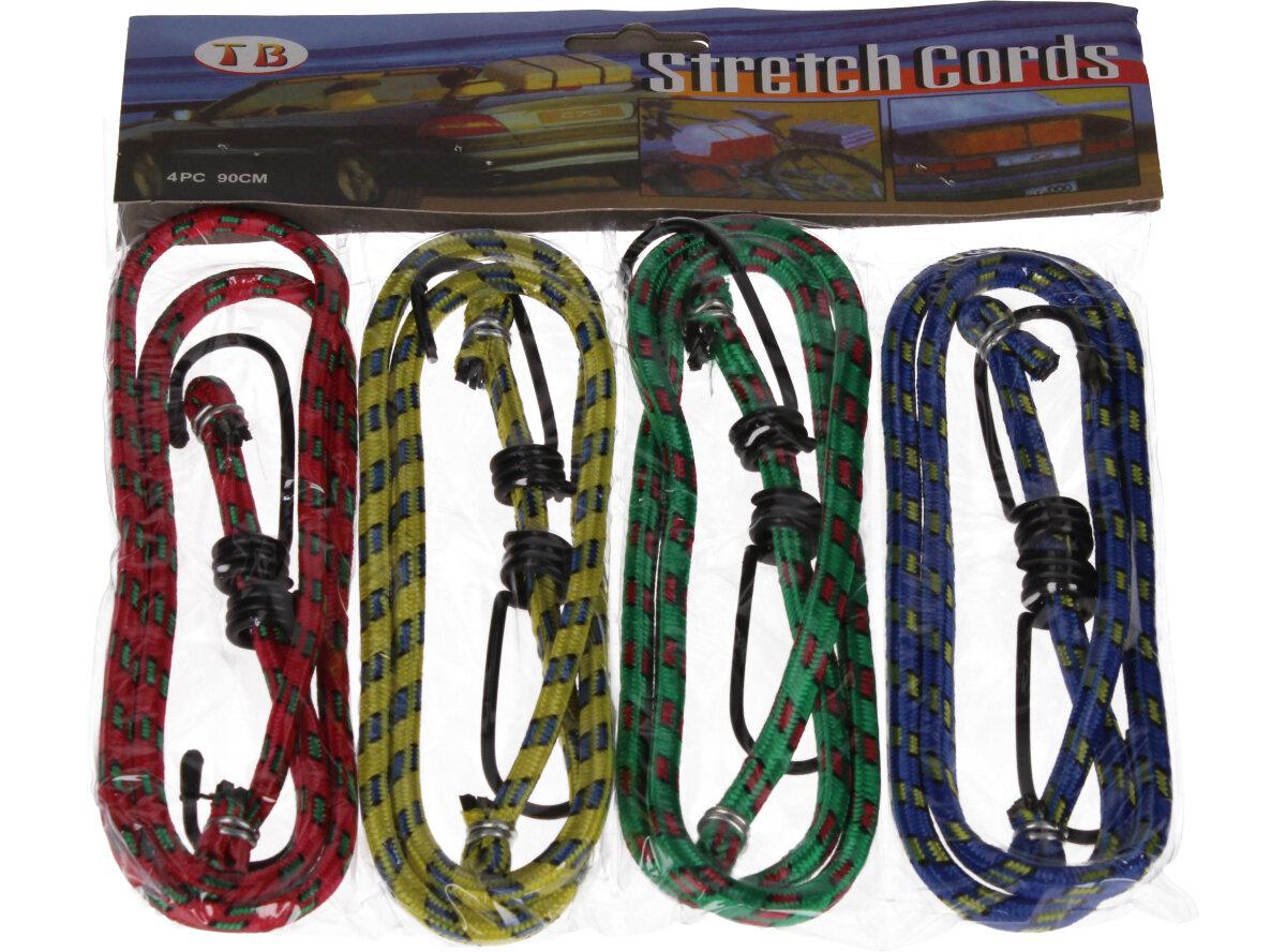 Sada obcahuje 4 kusy natahovacích gum pro uchyvená nákladu nebo zavazadel o délce 90 cm, které jsou na obou koncích zakončeny pevnými háčky
