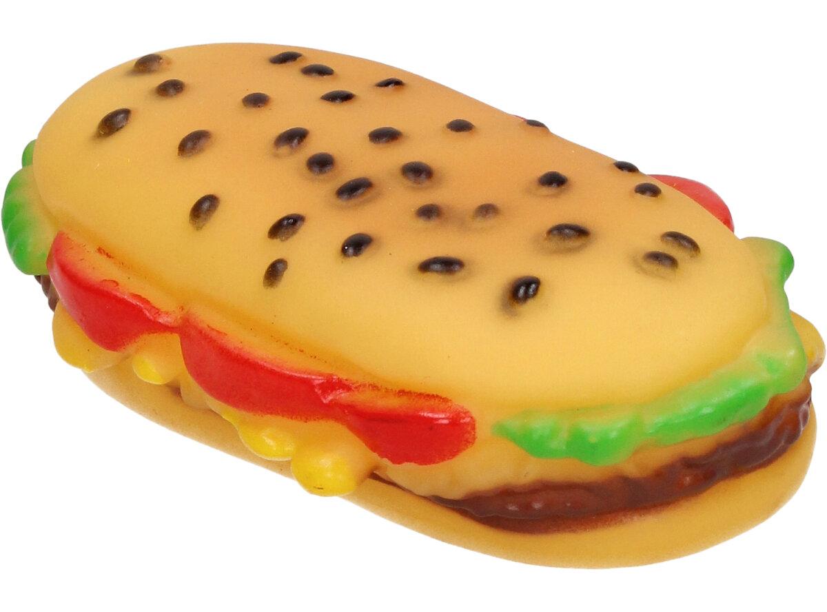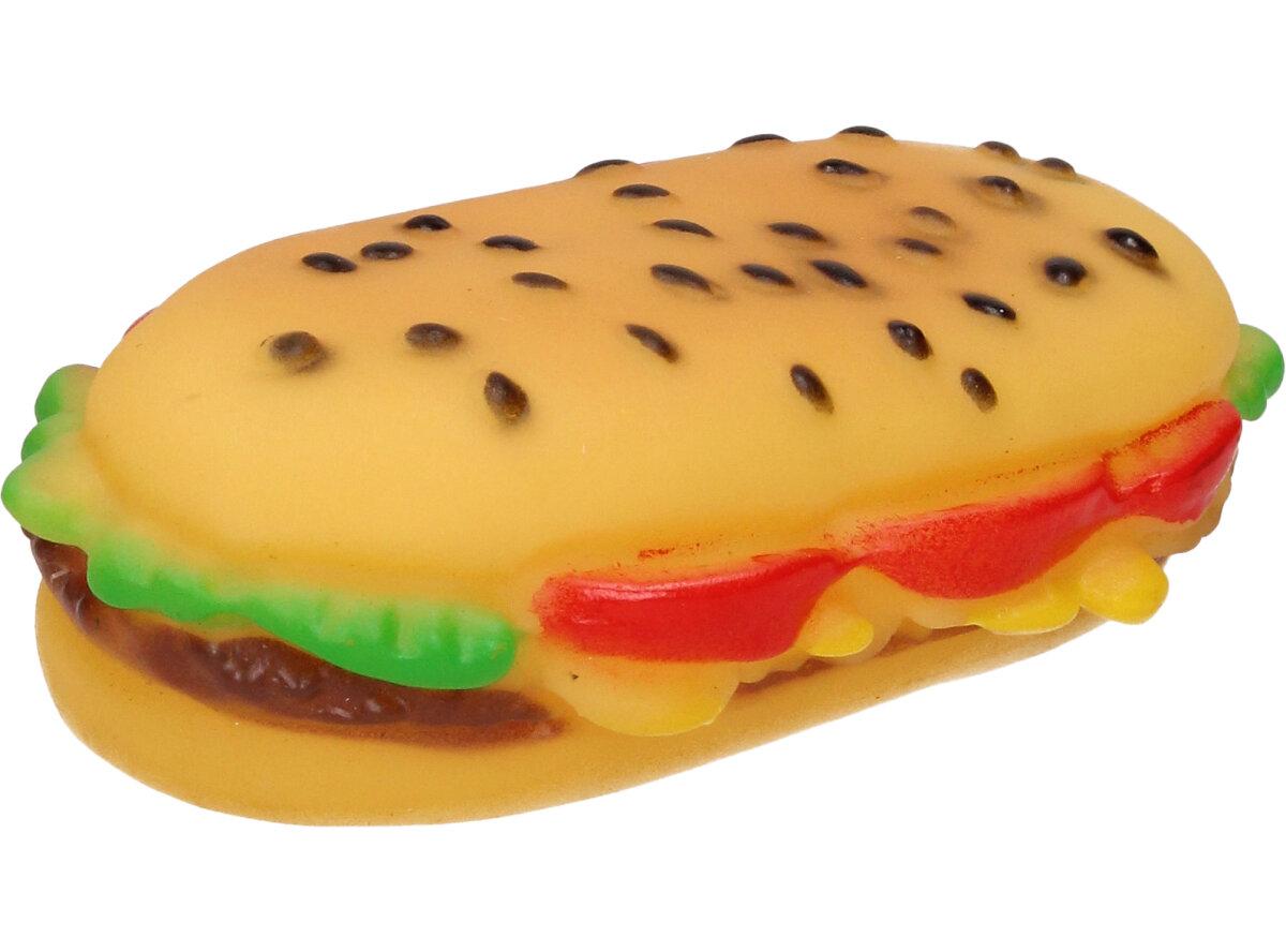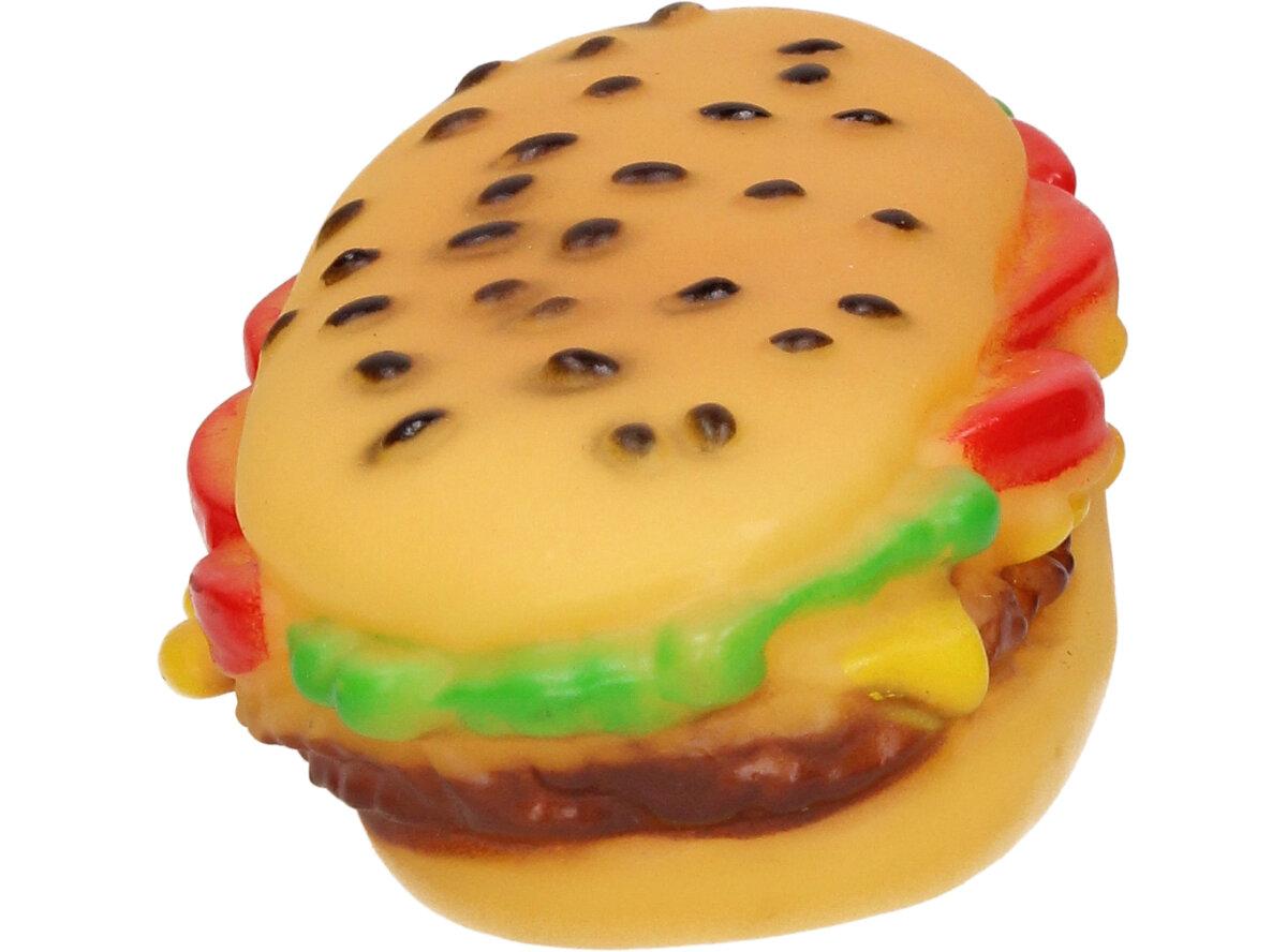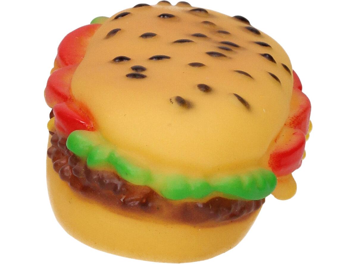 Pískací hračka ve tvaru Burgru, po zmáčknutí píska. Velikost 12 x 6,5cm