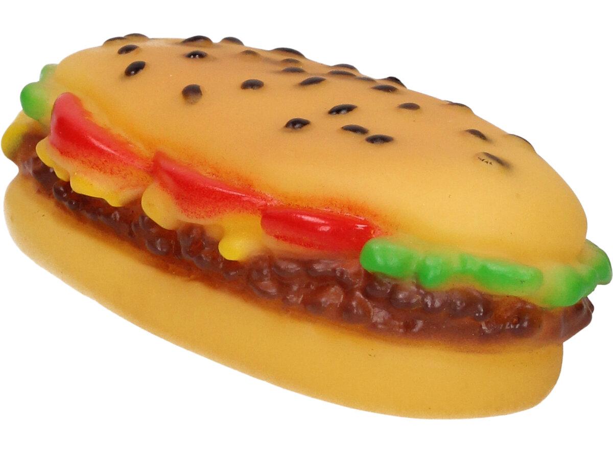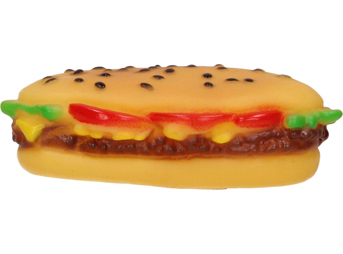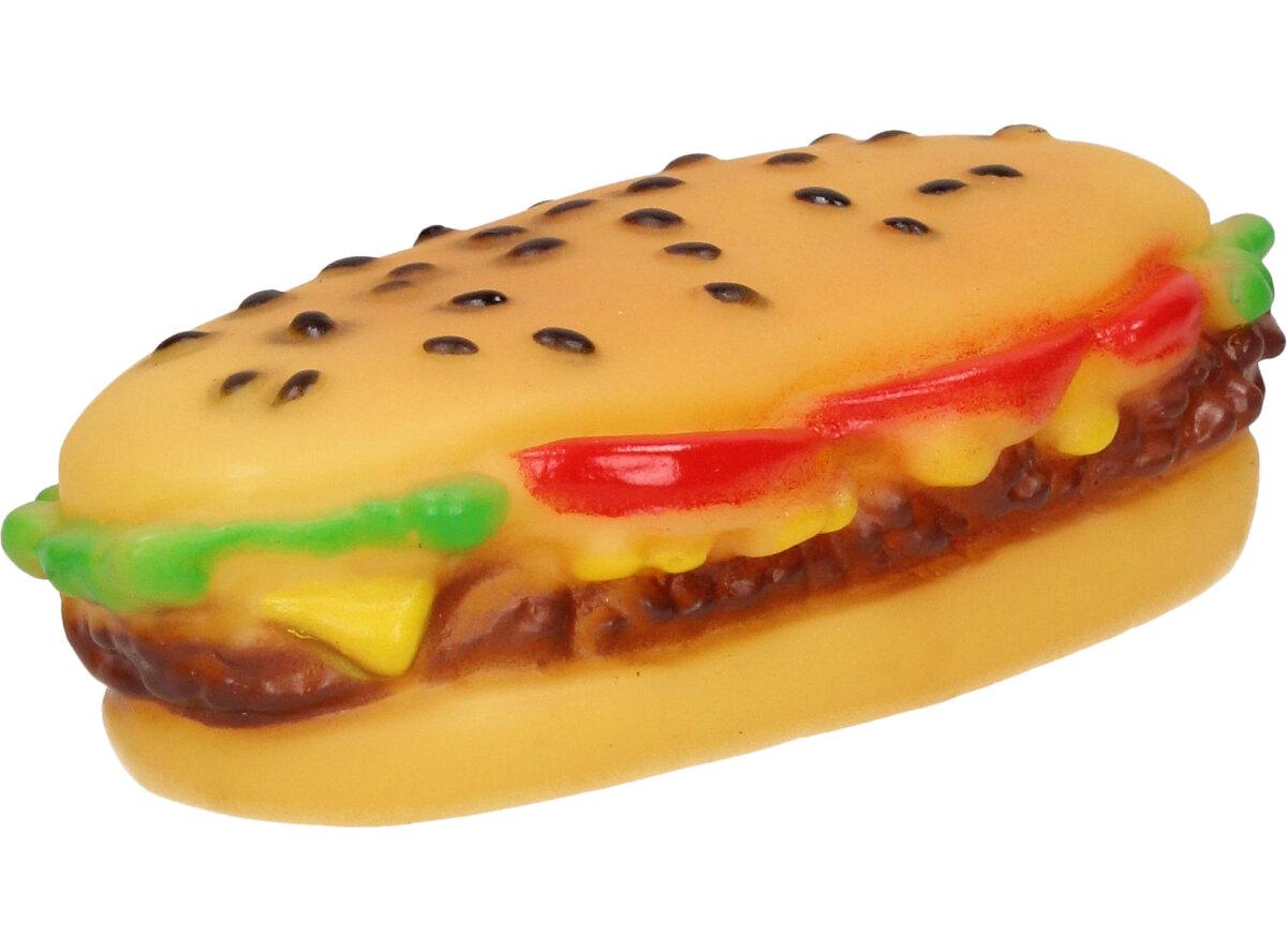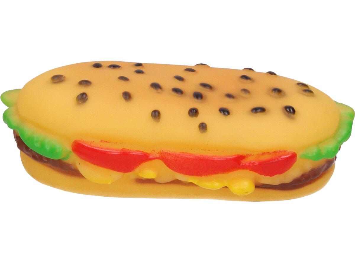 Pískací hračka ve tvaru Burgru, po zmáčknutí píska. Velikost 12 x 6,5cm