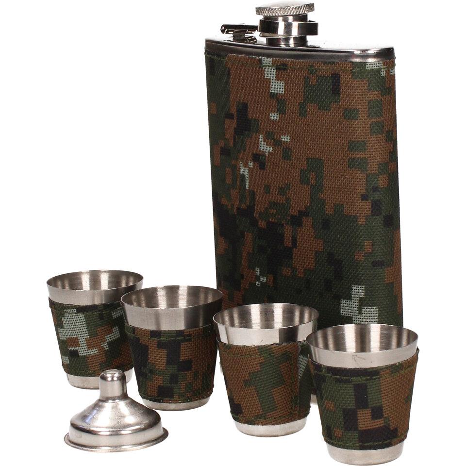 Zákazníkům to ulehčí práci: dárková sada placatka Khaki Dárková sada placatka khaki, čtyřmi panáky a nákevkou je vyrobena z nerezového materiálu a je vhodná jako vkusný dárek..