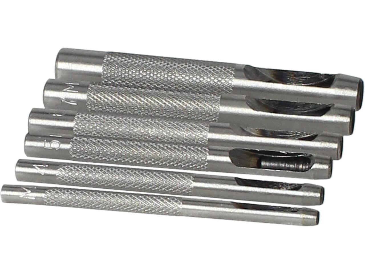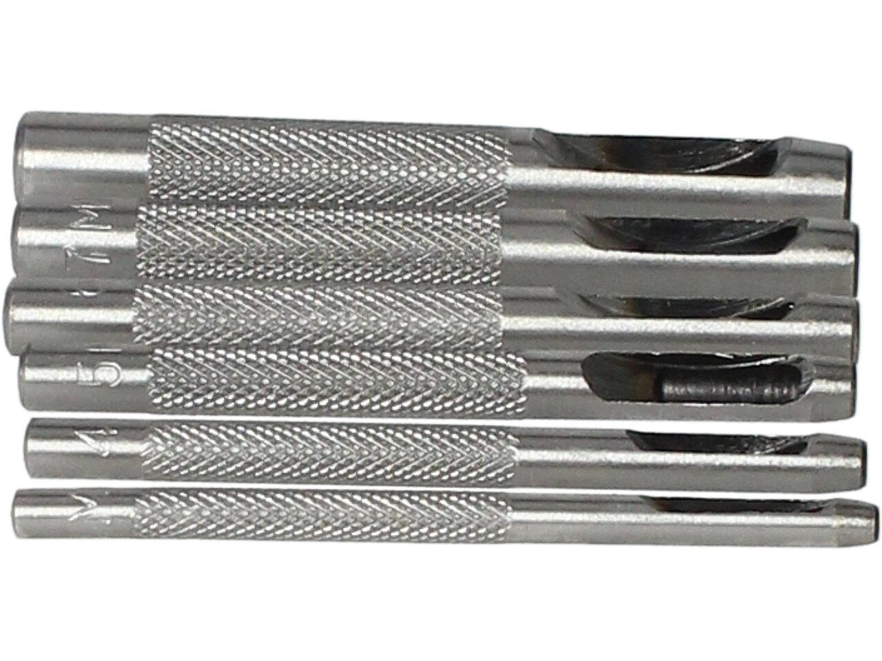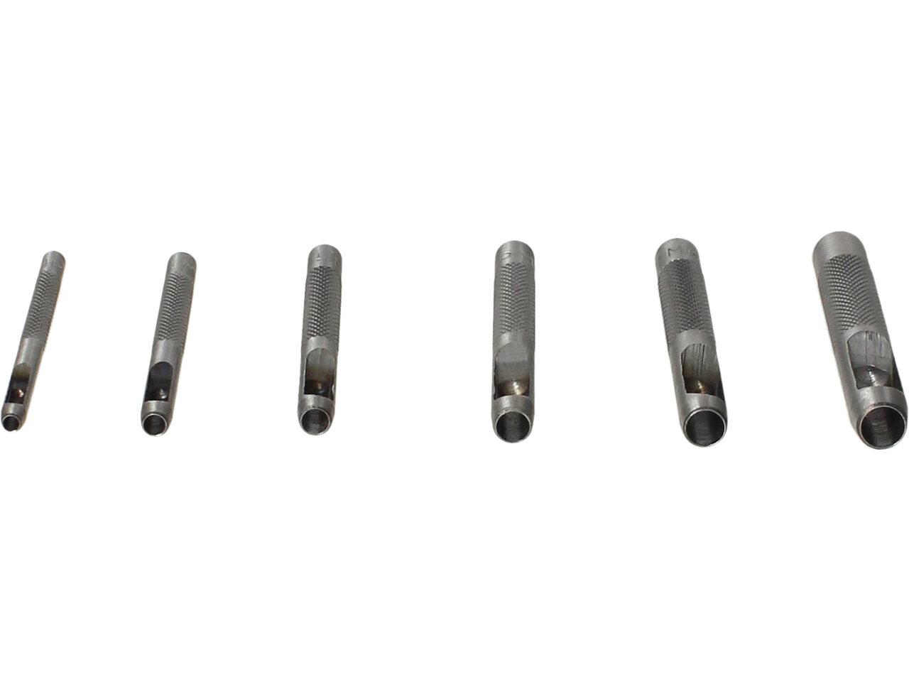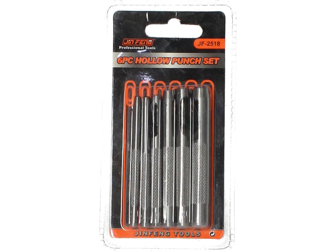 Sada děrovaček, 6 ks Jin Feng je domácí sada děrovač pro vytvoření dírky v opasku, brašně a jiných kožených výrobcích. Vhodné pro děrování děr do kůže, pryže atd. Ø 3; 4; 5; 6; 7; 8. Materiál: kalená uhlíková ocel.