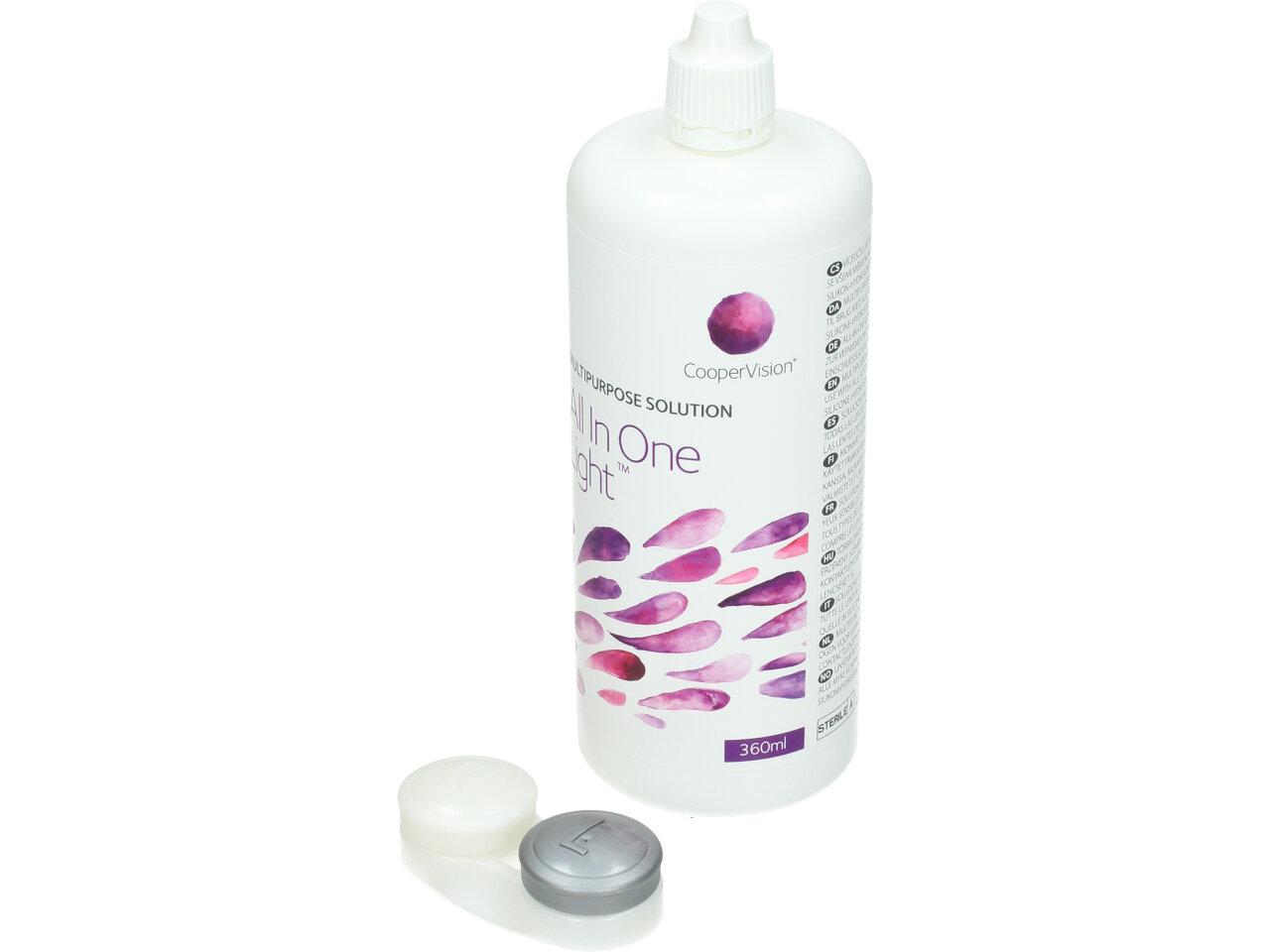All In One Light je víceúčelový roztok od společnosti CooperVision určený ke komplexní péči o všechny druhy měkkých kontaktních čoček. Je doporučován zejména nositelům s citlivýma očima, jelikož nedráždí oči a nevyvolává alergické reakce. All In One Light čistí, dezinfikuje, lubrikuje, oplachuje, odstraňuje bílkoviny a slouží k bezpečnému uchovávání čoček. Speciální složení roztoku zaručí čočkám celodenní vlhkost a lubrikaci a tím je uživatelům kontaktních čoček zajištěn vysoký komfort nošení.