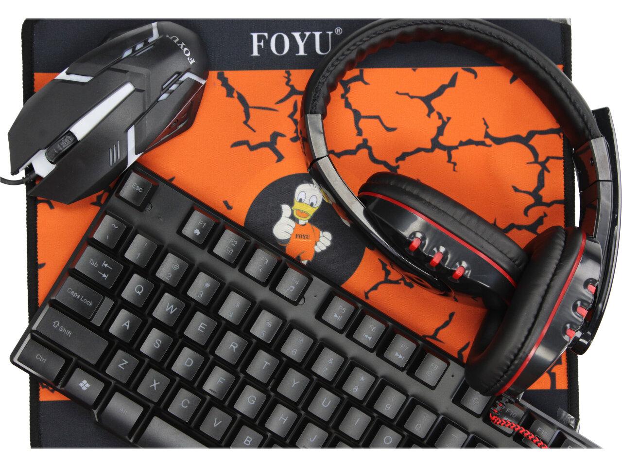 Je to užitečné do běžného provozu — hrací kombo 4v1 Hrací set od značky Foyu kombo 4v1 obsahuje hrací klávesnici, podložku pod myš, myš a hrací sluchátka s mikrofonem..