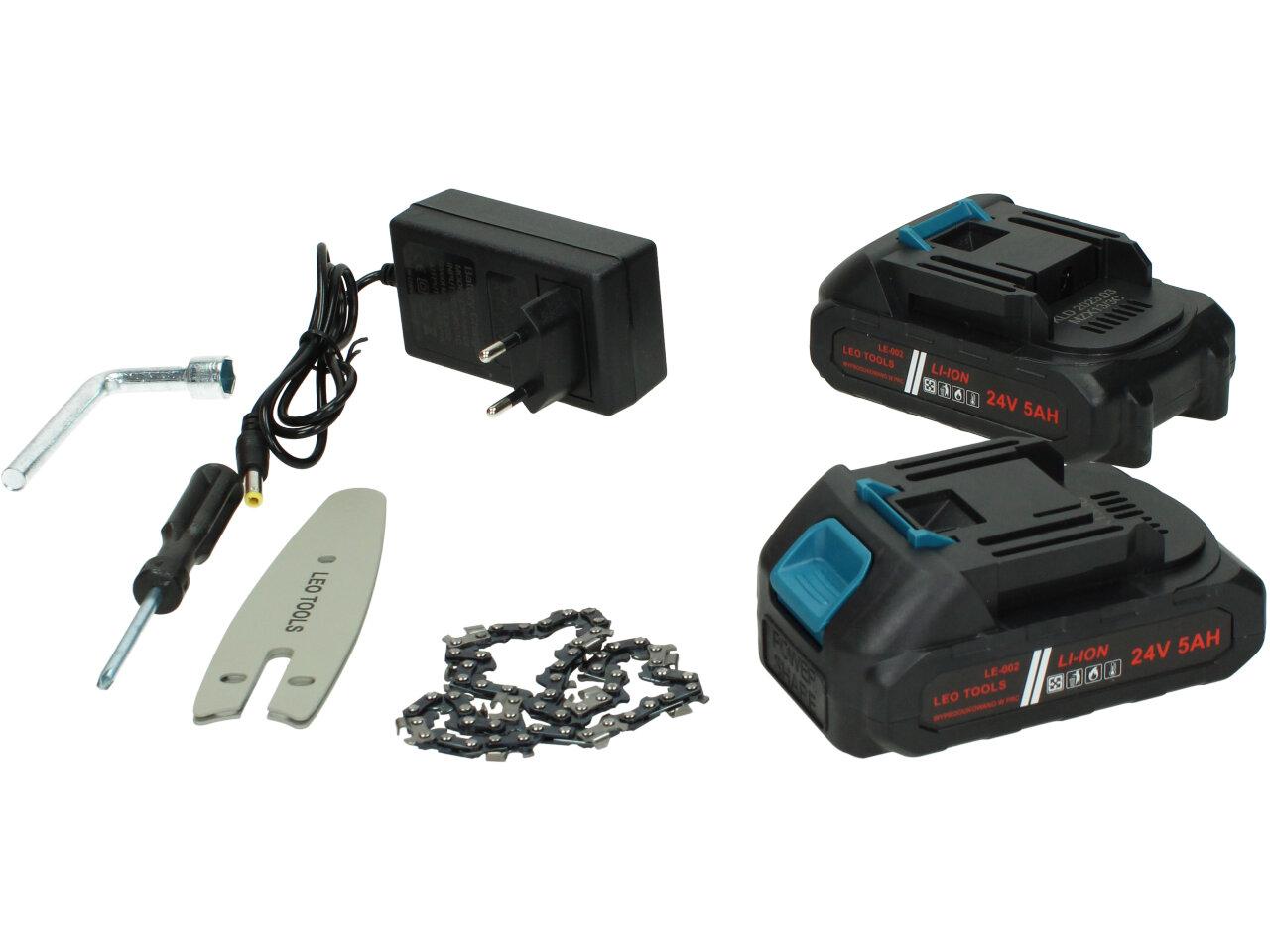 - Obsah balení: pila, 2x výkonná baterie 5 000 mAh, nabíječka, řetěz, klíč, šroubovák