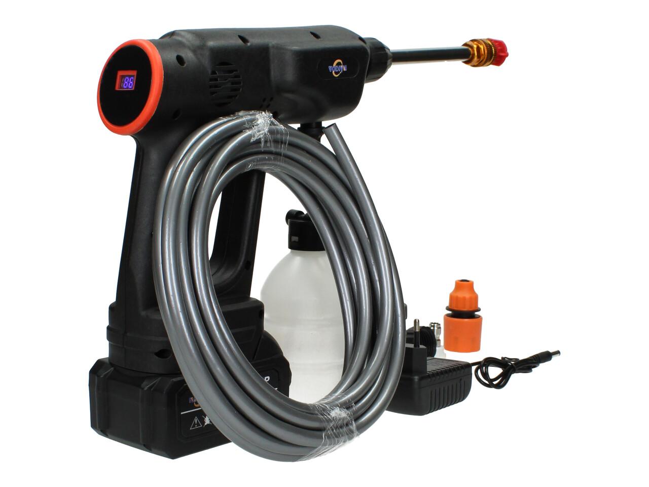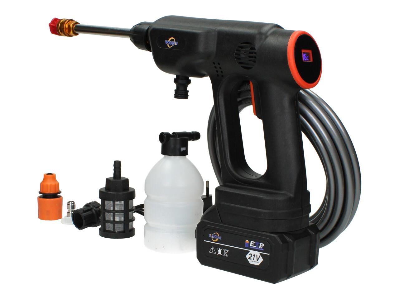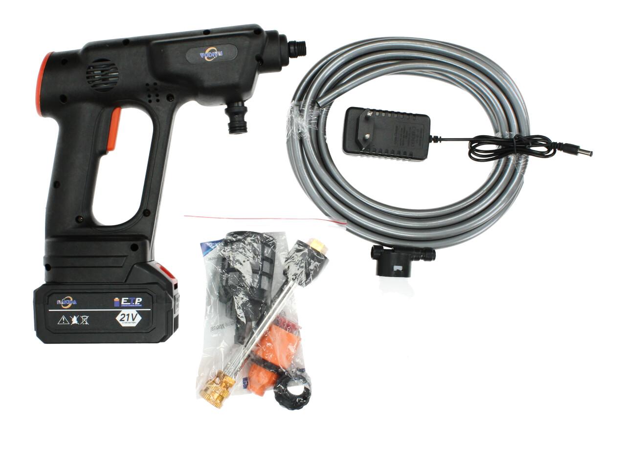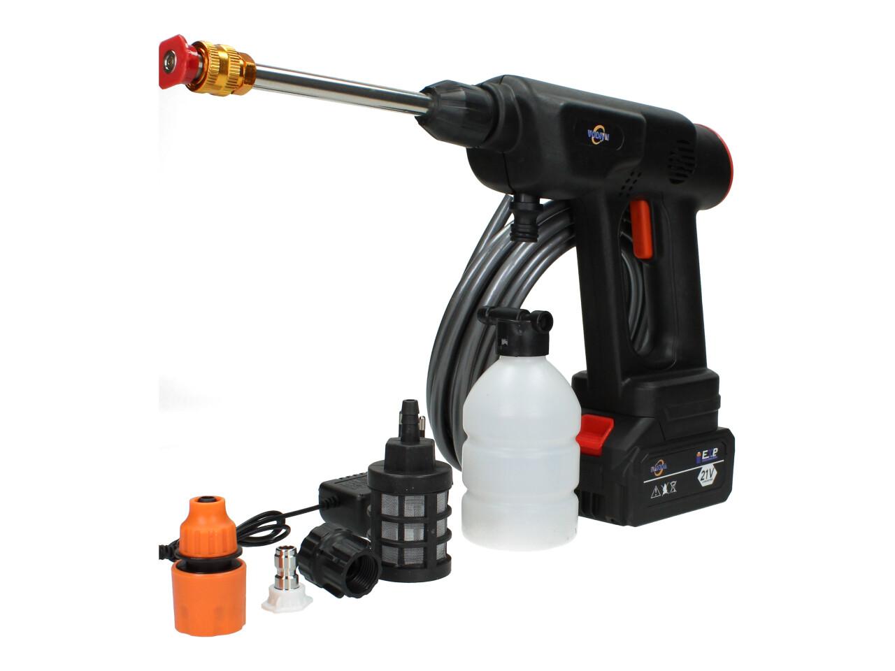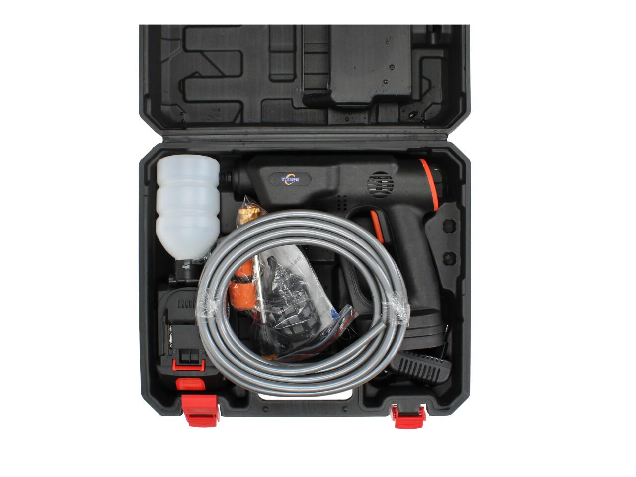 - příslušenství 1ks baterie a 1 ks nabíječka, multifunkční tryska, hadice s filtračním košem a koncovkou pro připojení k pistoli, úložný kufr, nádobka na čistící prostředek