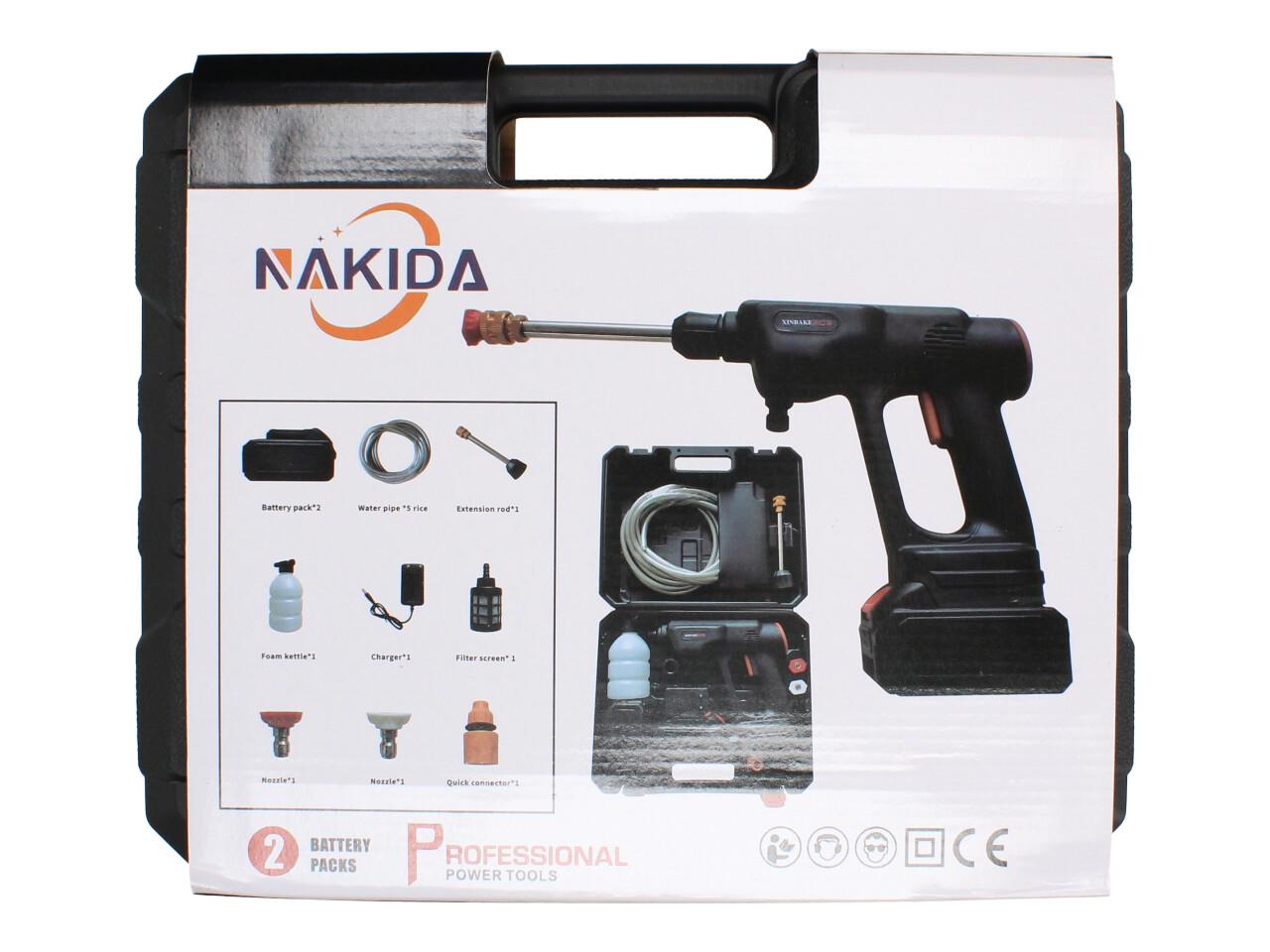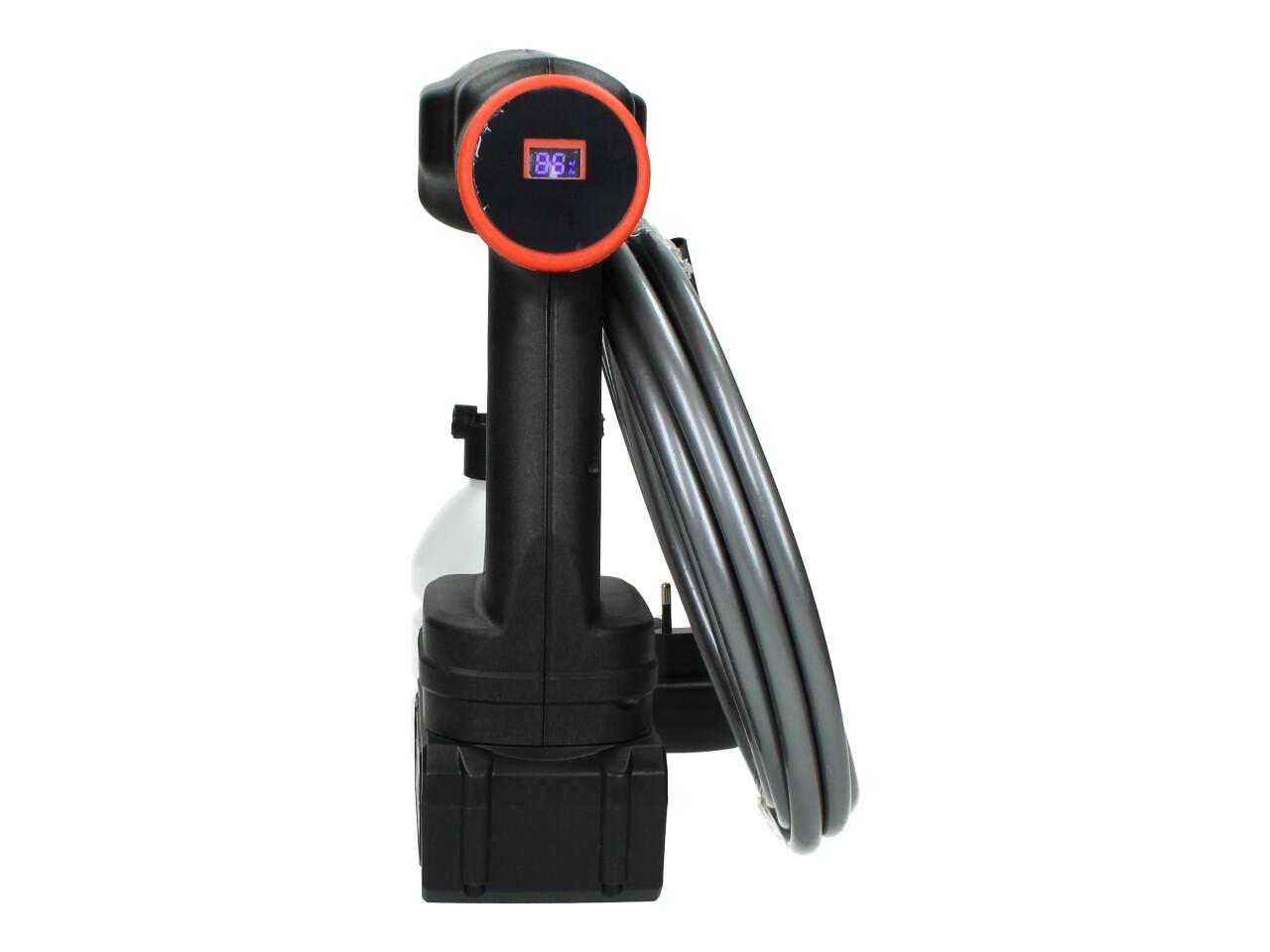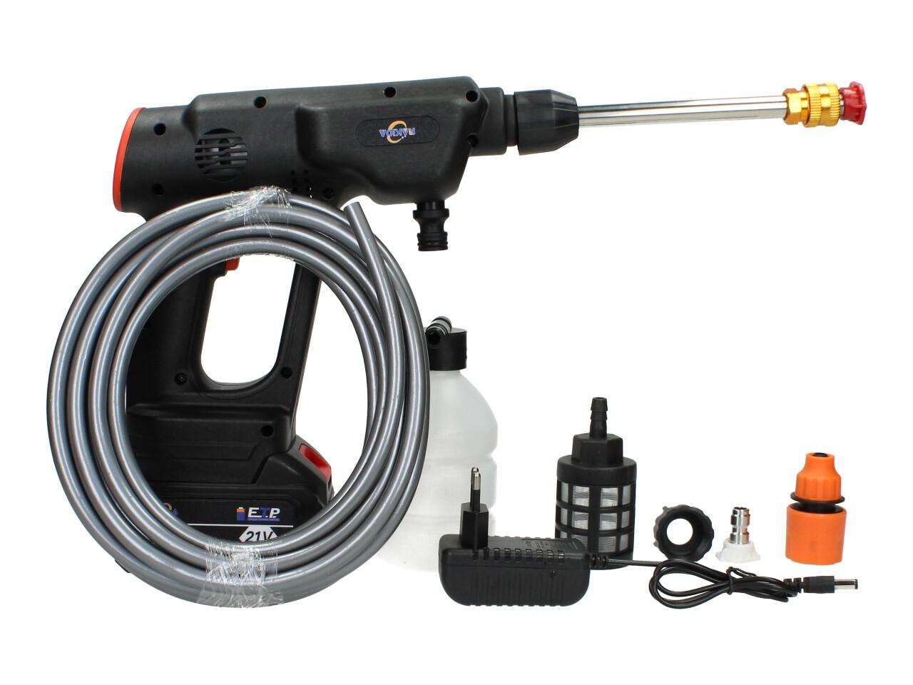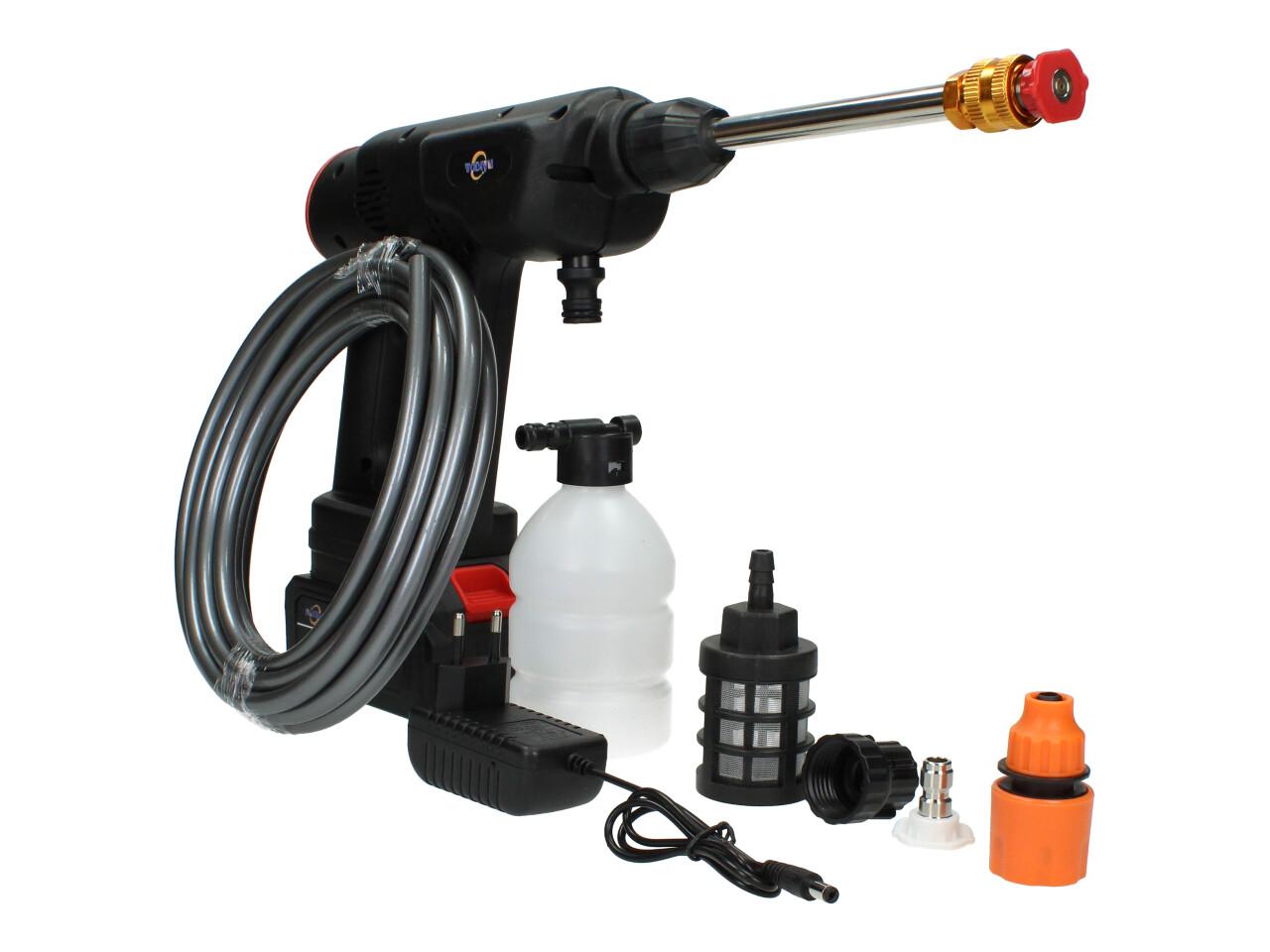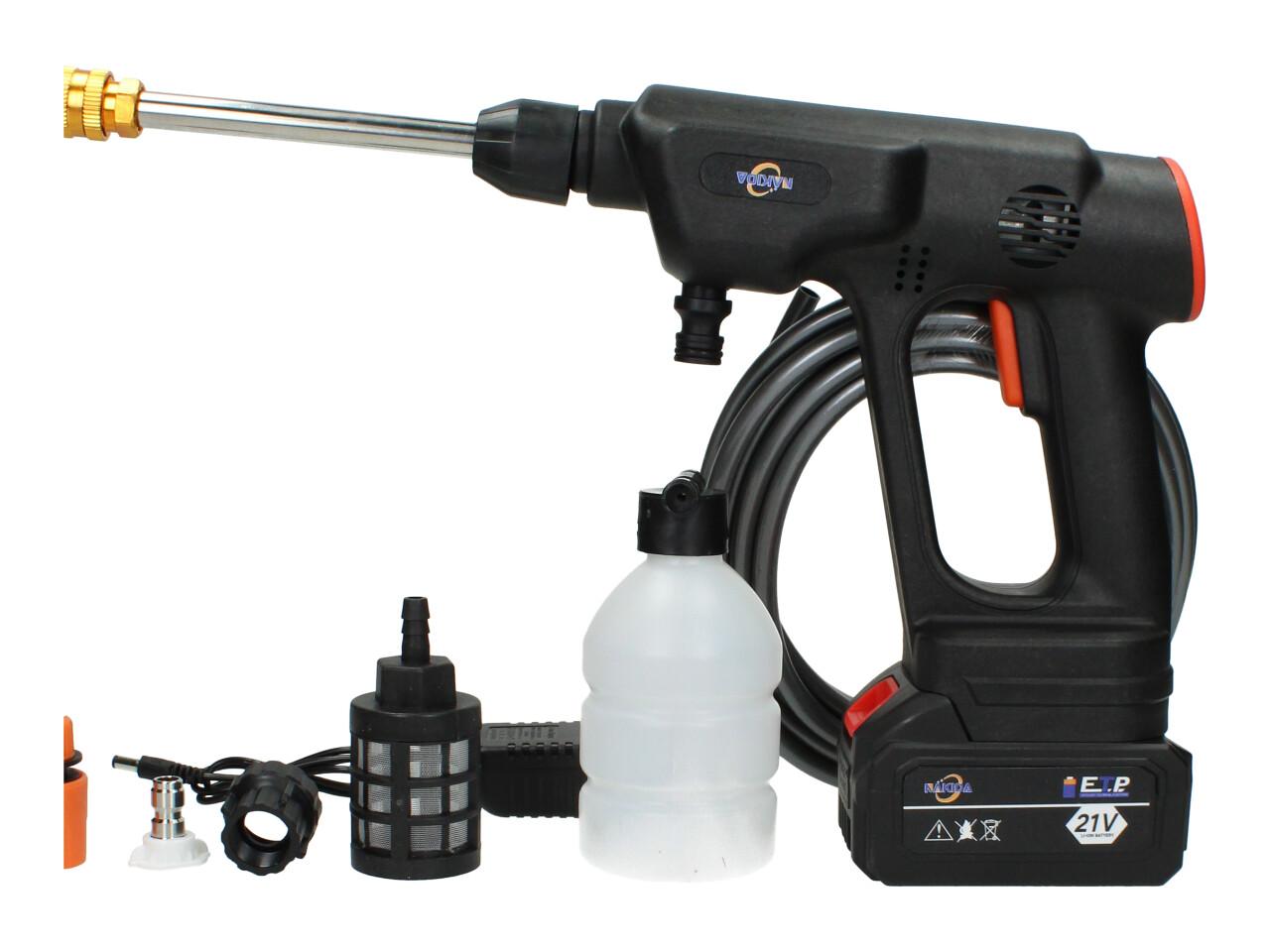 - příslušenství 1ks baterie a 1 ks nabíječka, multifunkční tryska, hadice s filtračním košem a koncovkou pro připojení k pistoli, úložný kufr, nádobka na čistící prostředek