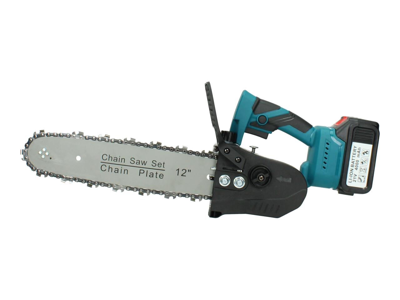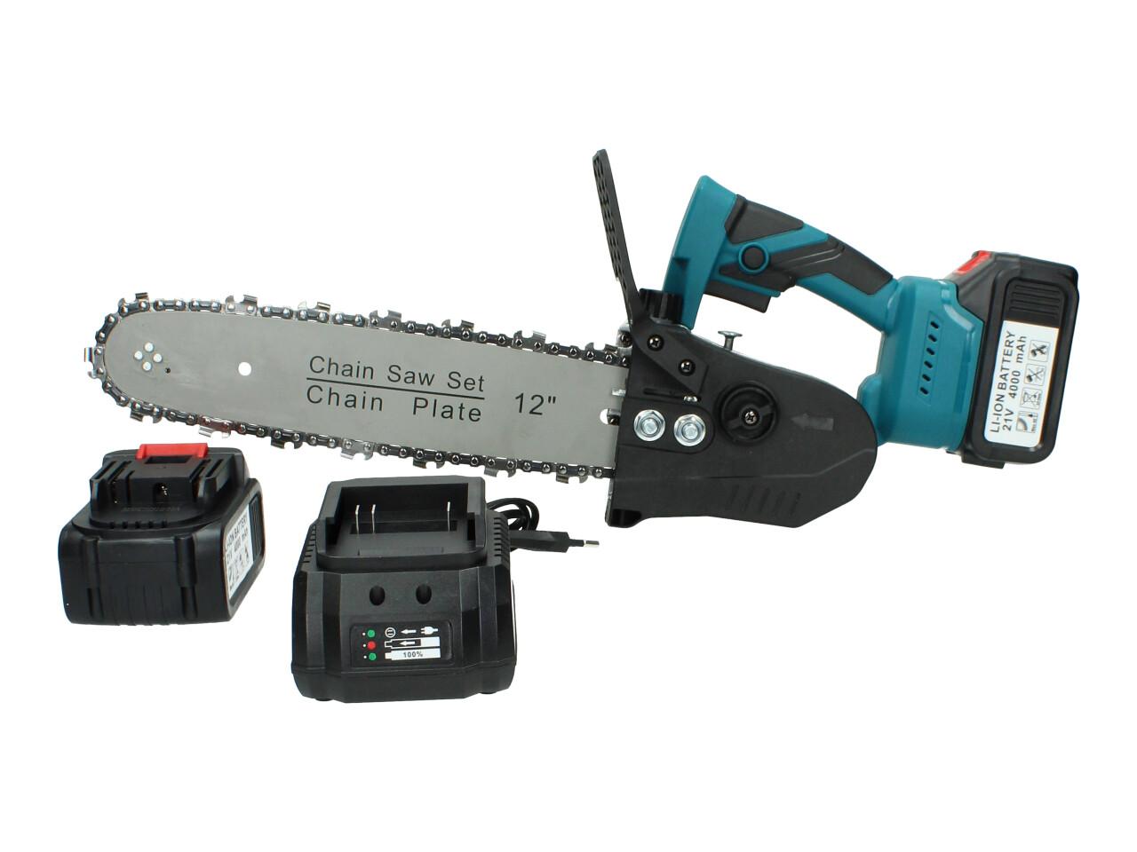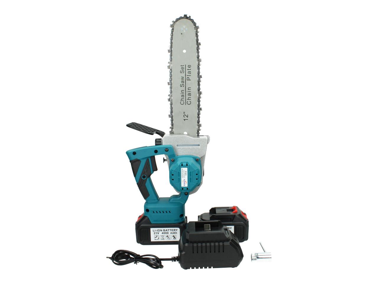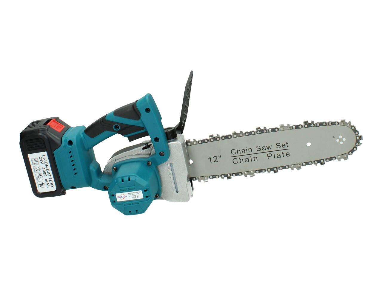 Pilka s lištou 12 palců pro řezání větších nebo špatně přístupných větví včetně 2 kusů akumulátorů, nabíječky a řetězu. Pila je vybavena bezklíčovým napínáním řetězu a přímazem lišty a řetězu tak, jako u profesionálních motových pil. Pilka je tak určena pro větší zátěž (nádobka na olej).