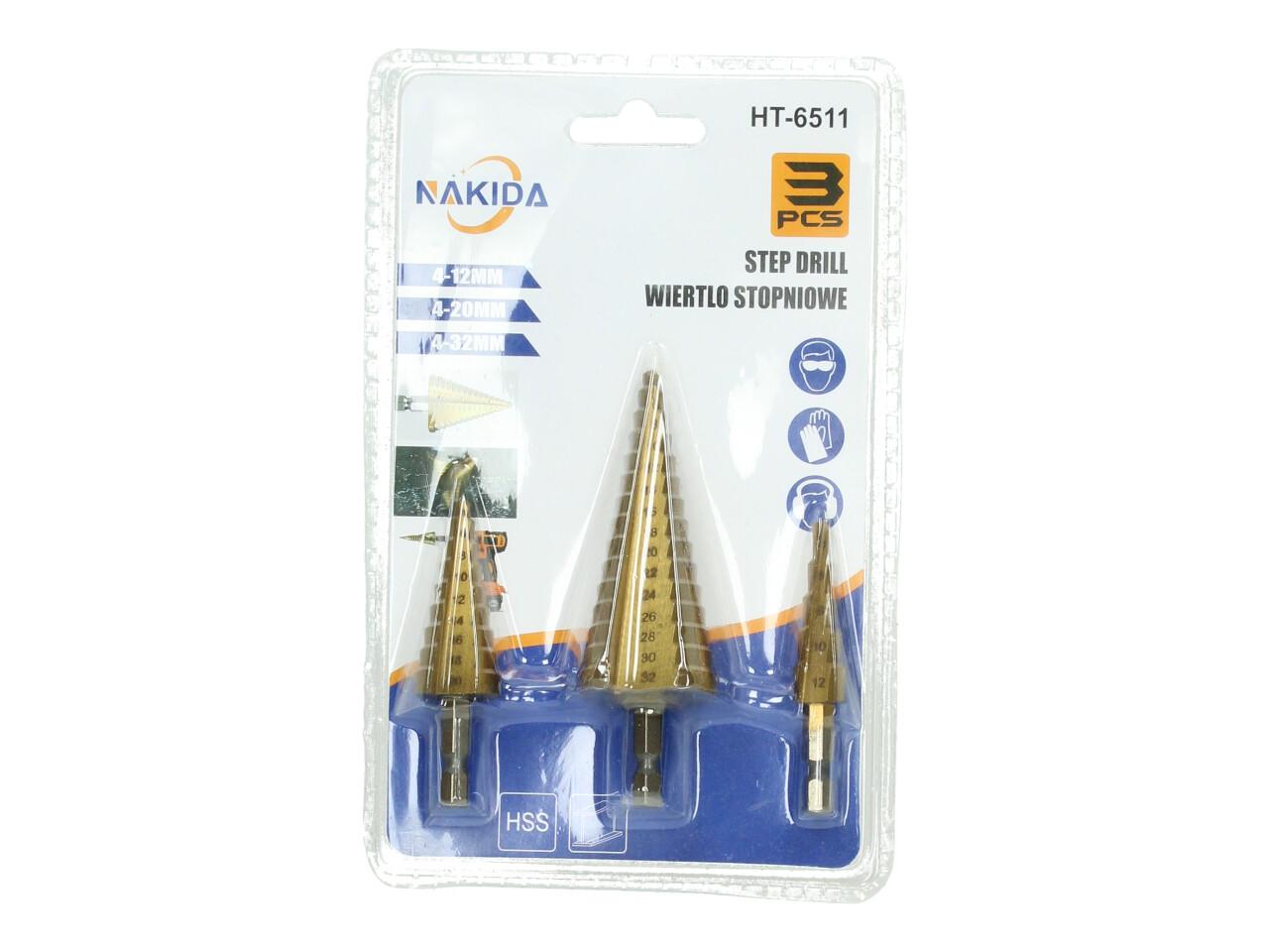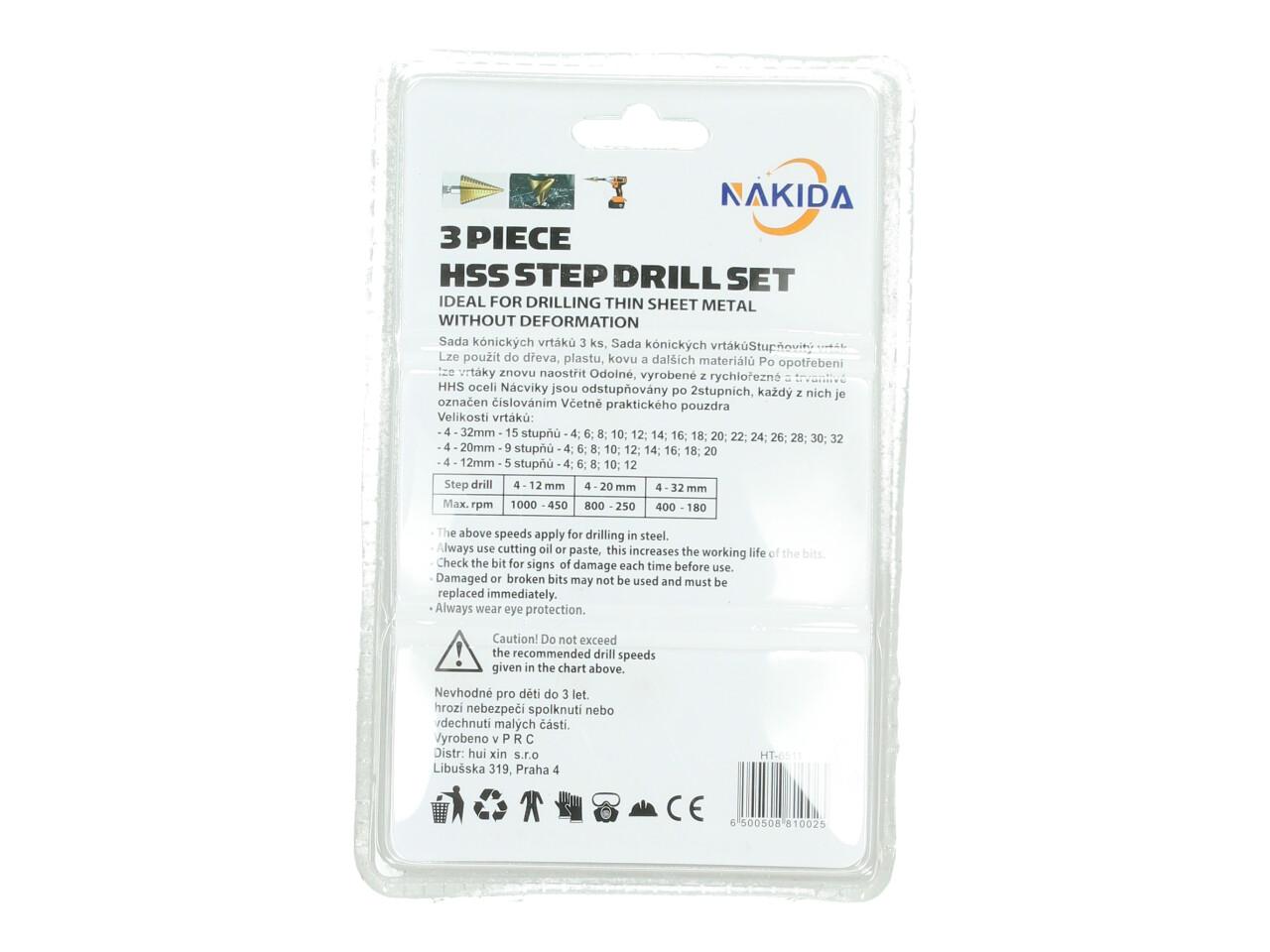 Sada 3 kusy kuželový stupňovitý vrták Nakida HT-6511 o rozměrěch 4-12mm, 4-20mm, 4-32mm