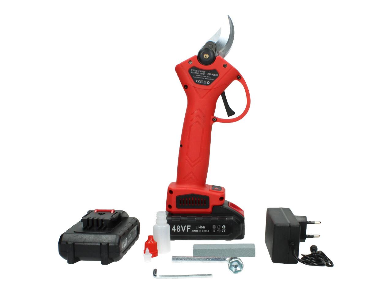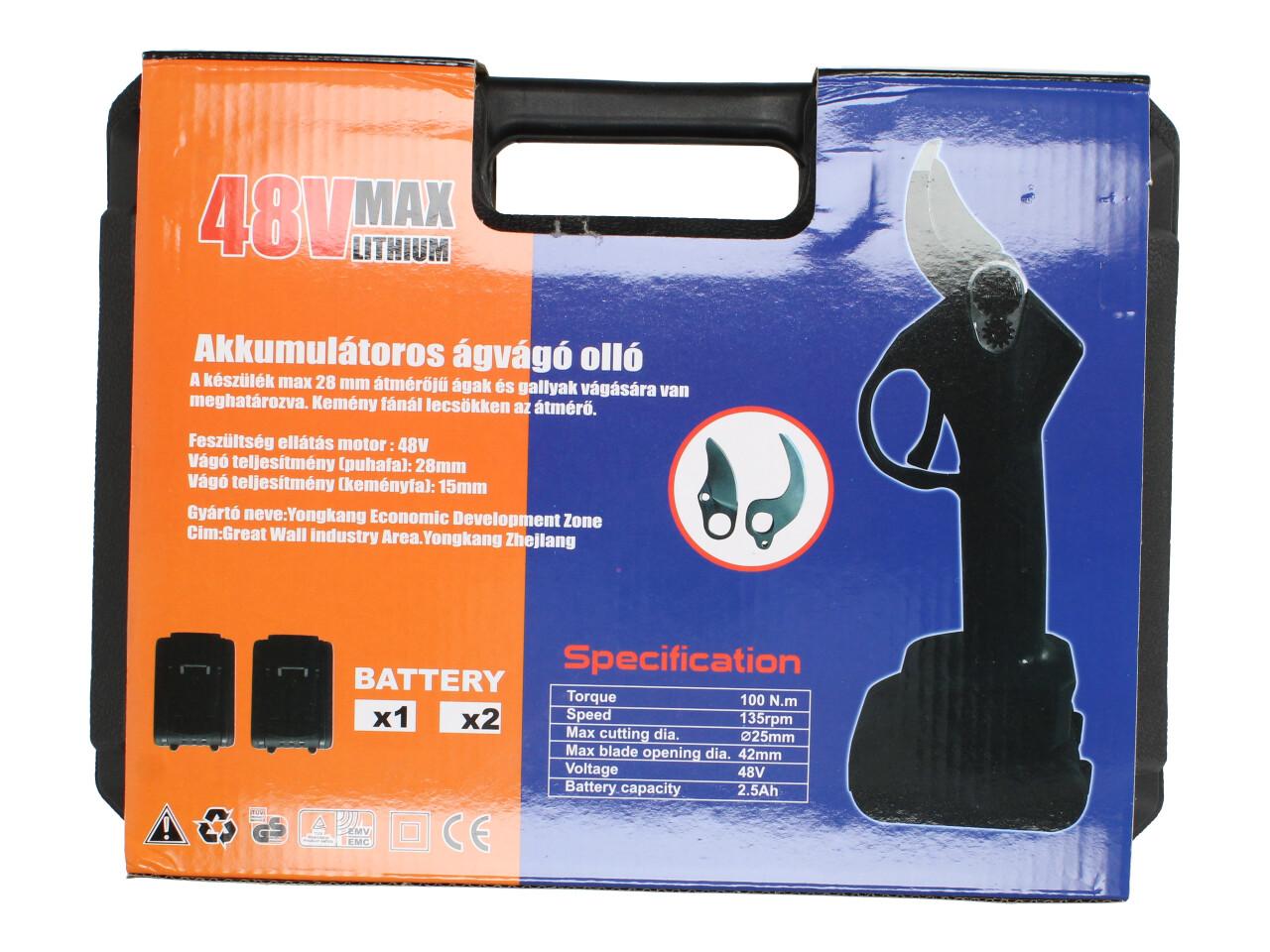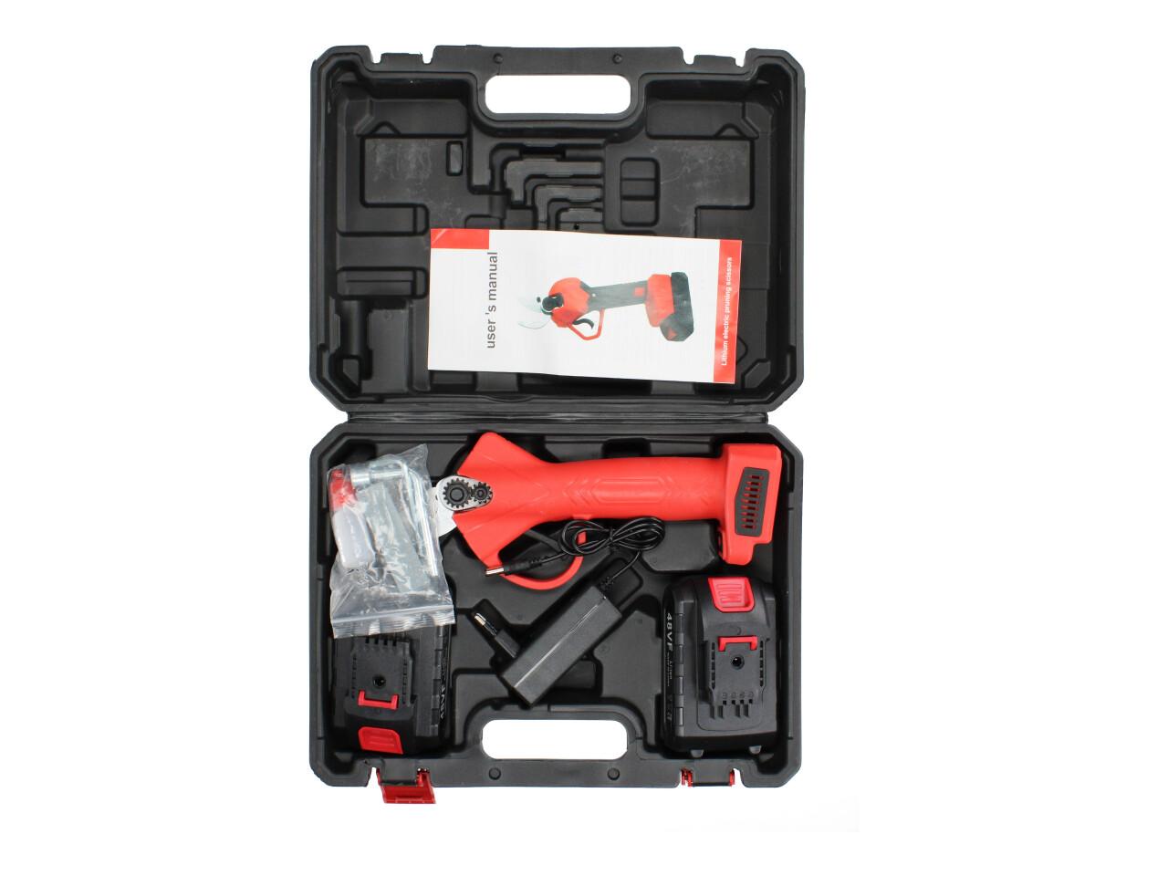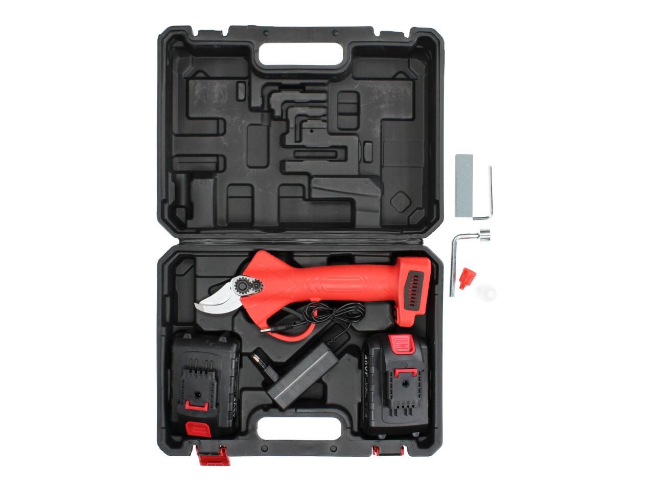 V sadě naleznete aku nůžky na stříhání větví, dva nabíjecí akumulátory 48VF včetně nabíječky, kufřík a příslušenství. Nůžky jsou vhodné pro štípání větví do průměru 25mm, se sílou 100Nm, otáčkami 135 rpm, maximální otevření nůžek je 42mm s napetím baterií 48V a kapacitou 2,5Ah