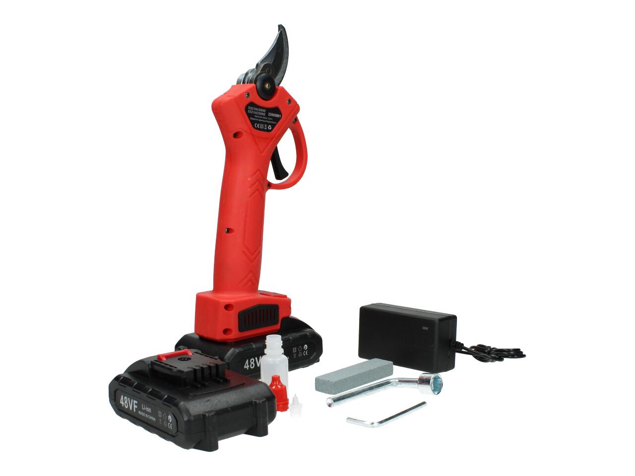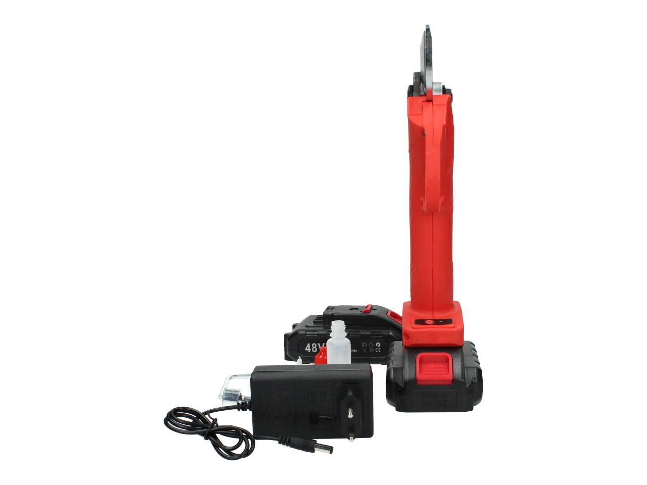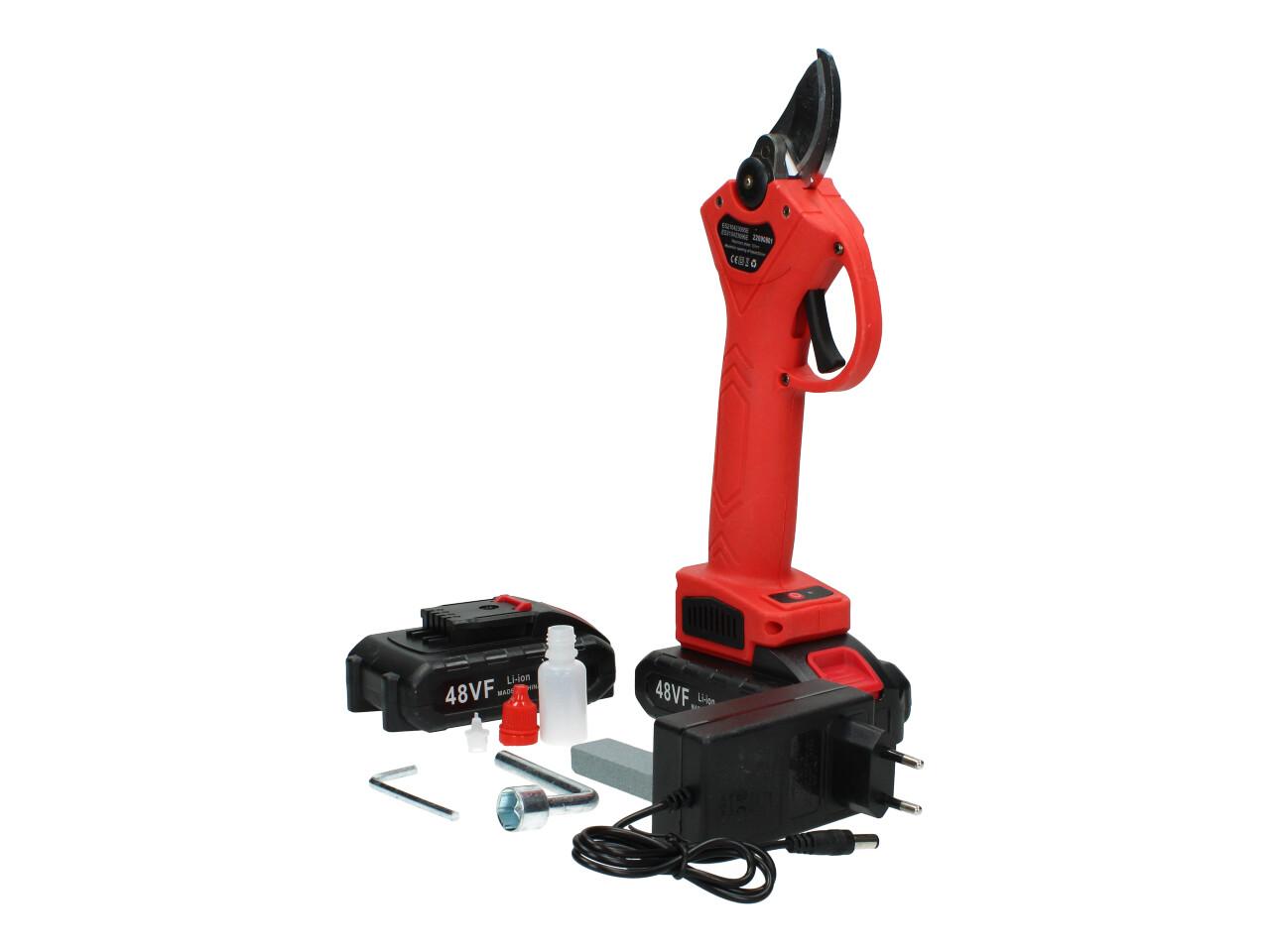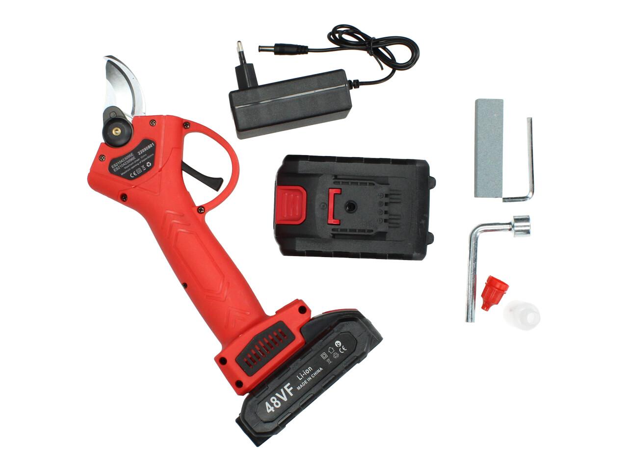 V sadě naleznete aku nůžky na stříhání větví, dva nabíjecí akumulátory 48VF včetně nabíječky, kufřík a příslušenství. Nůžky jsou vhodné pro štípání větví do průměru 25mm, se sílou 100Nm, otáčkami 135 rpm, maximální otevření nůžek je 42mm s napetím baterií 48V a kapacitou 2,5Ah