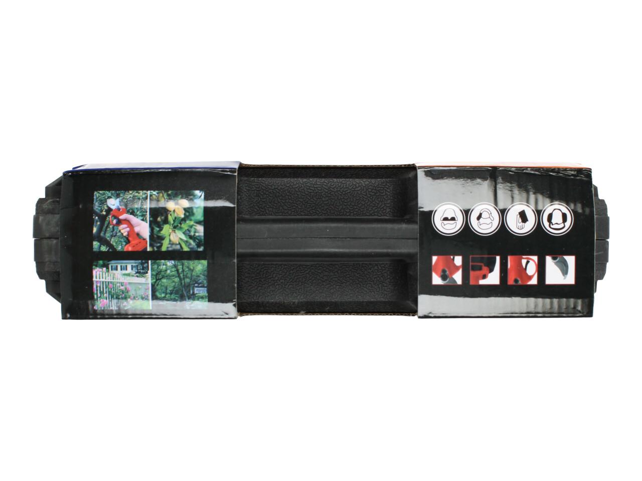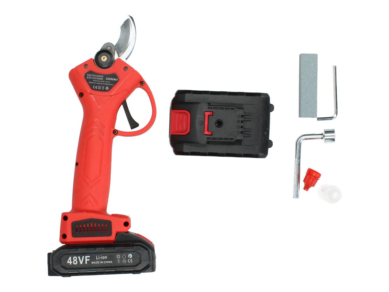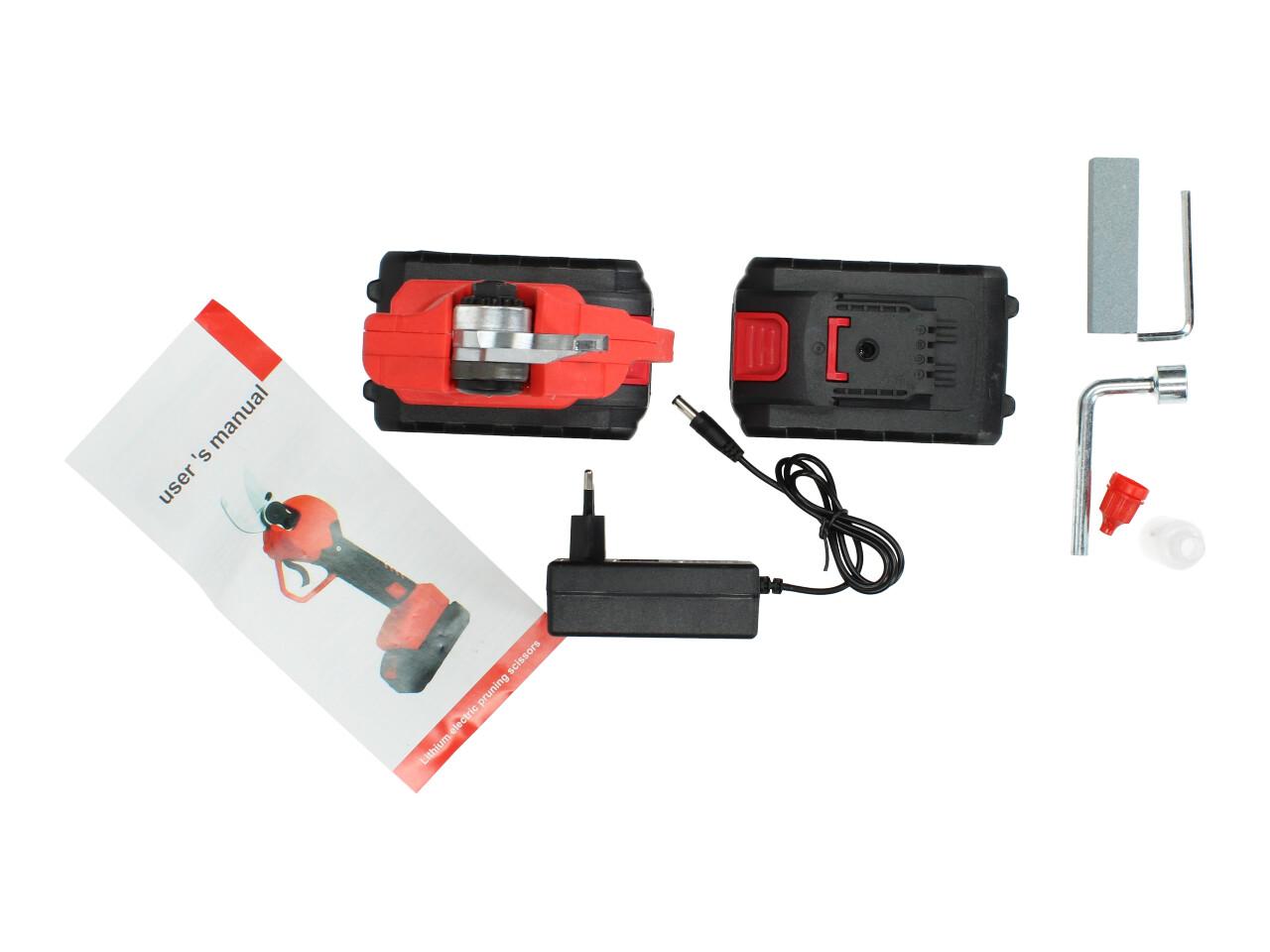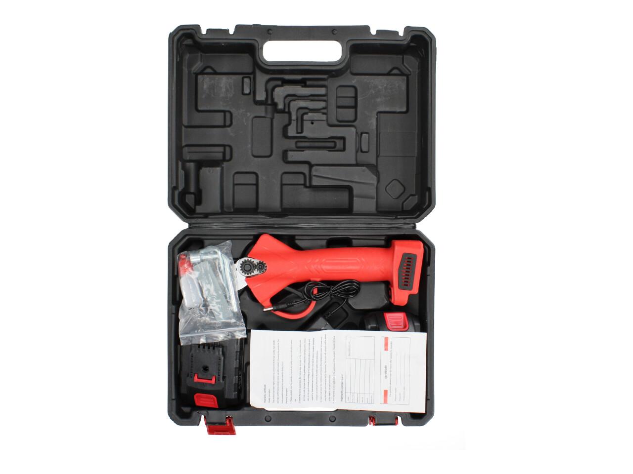 V sadě naleznete aku nůžky na stříhání větví, dva nabíjecí akumulátory 48VF včetně nabíječky, kufřík a příslušenství. Nůžky jsou vhodné pro štípání větví do průměru 25mm, se sílou 100Nm, otáčkami 135 rpm, maximální otevření nůžek je 42mm s napetím baterií 48V a kapacitou 2,5Ah