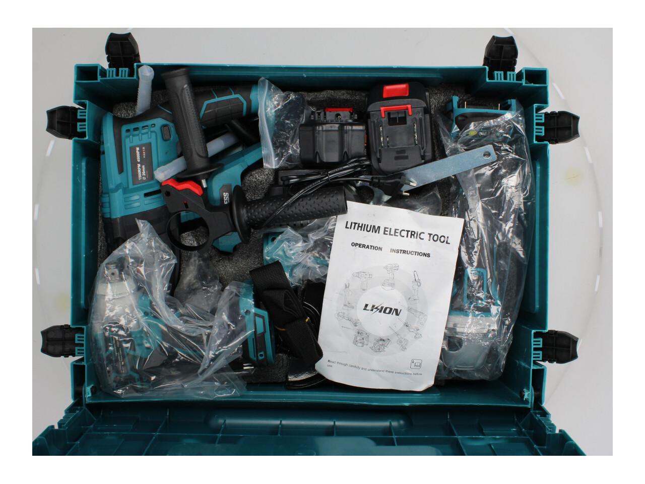 Sada obsahuje kufr, aku flexu, aku bourací kladivo, aku vrtačku a aku rázový utahovák. Dále obsahue nástrčení klíče pro aku rázový utahovák, nabíječku, sadu magnetických bitů a popruh na rameno. Dále obsahuje 2x vrták SDS průměr 6 + 8 délka 15xm a poutko přes rameno.