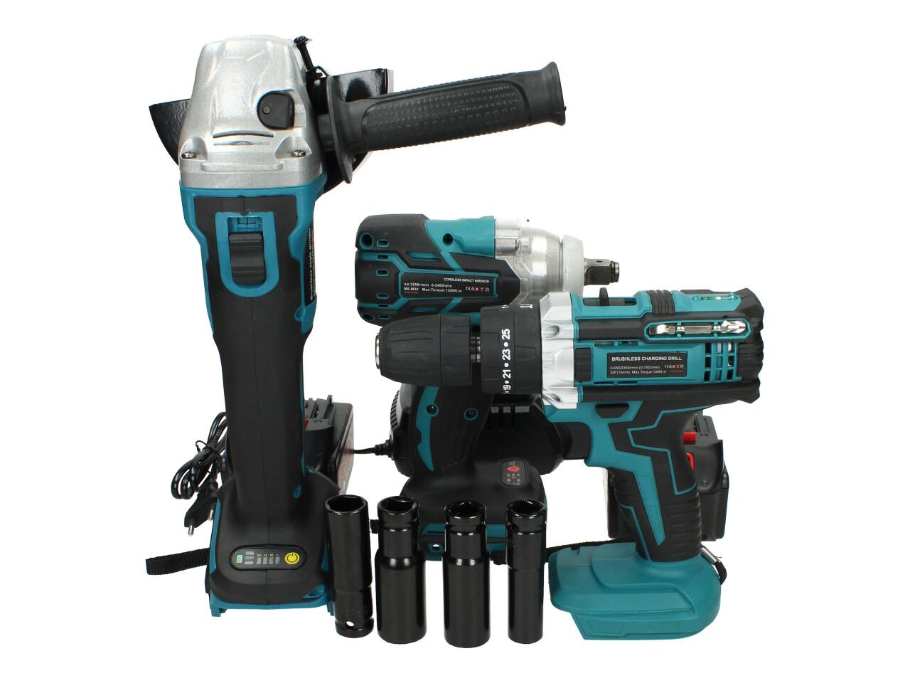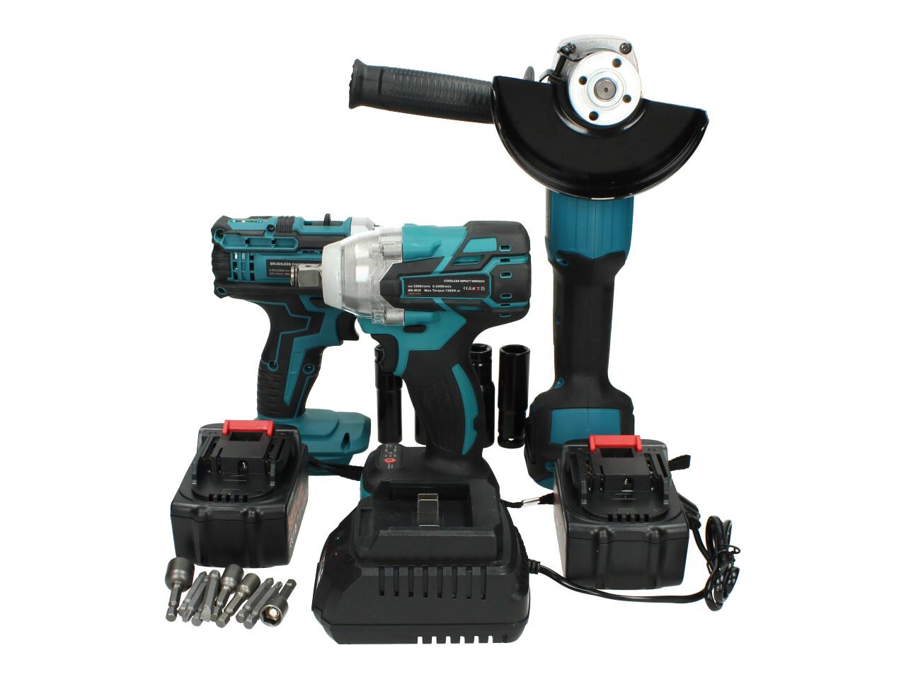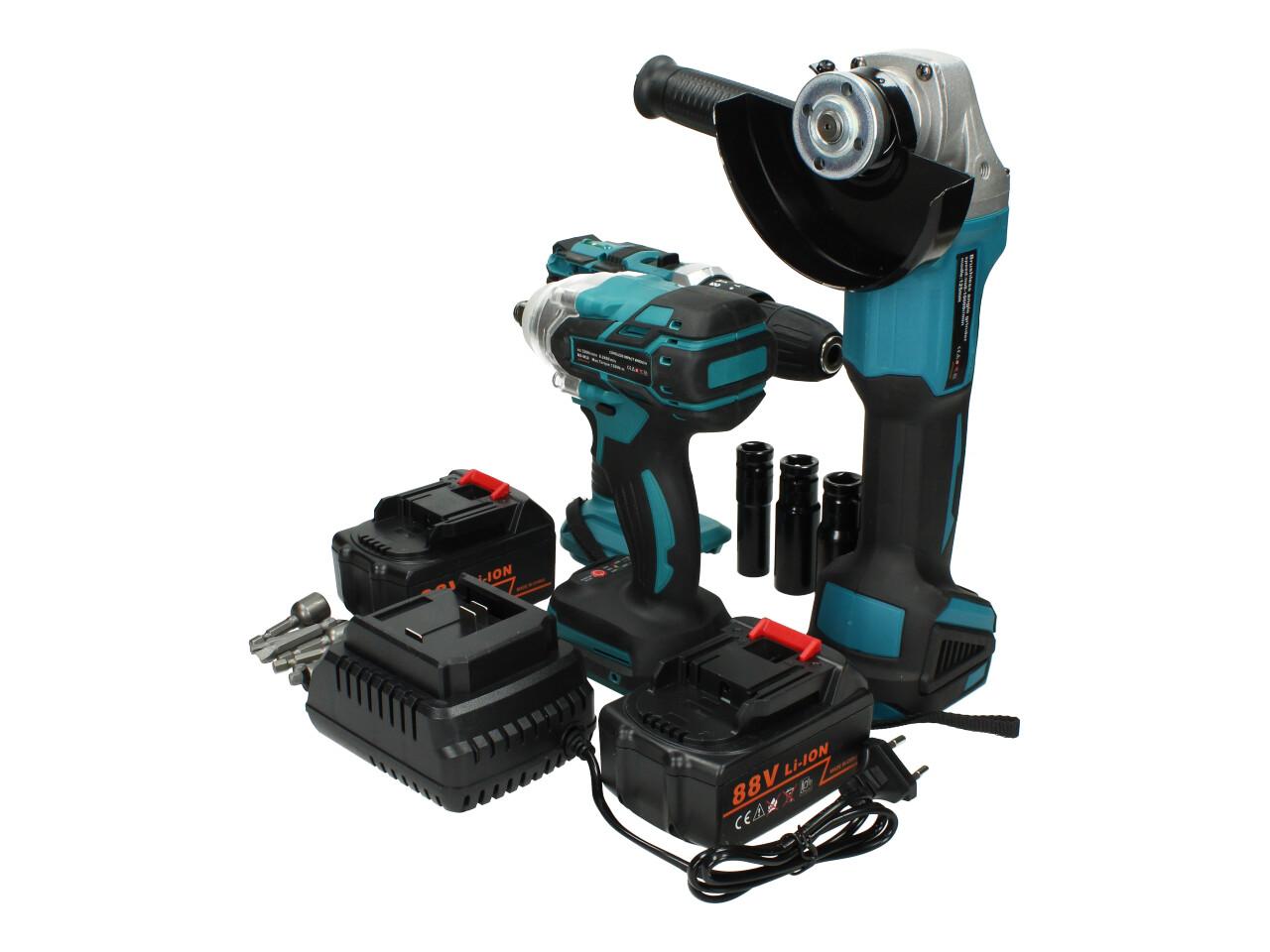 Kvalitní sada Aku nářadí včetně baterií a nabíječky a příslušenství jako ořechy a čroubováky s magnetem. Sada obsahuje aku rázový utahovák, aku vrtačku s příklepem a utahovák, 2 akumulátory, nabíječku a příslušenství
