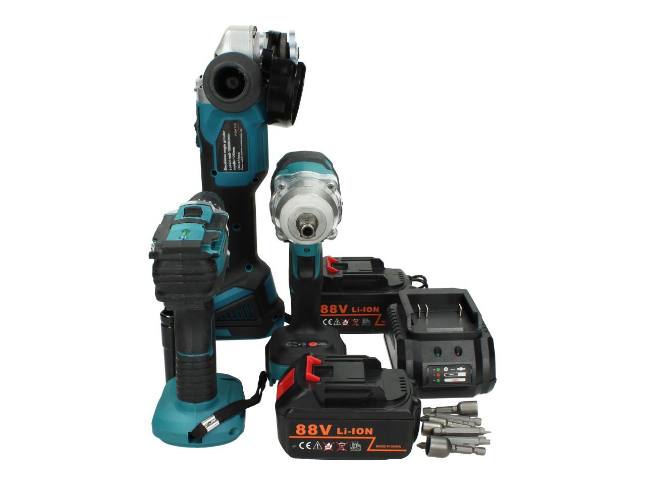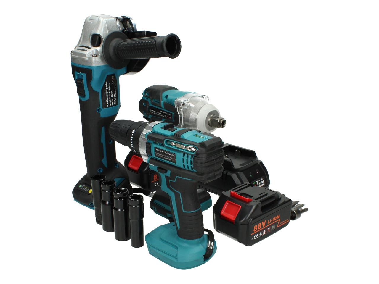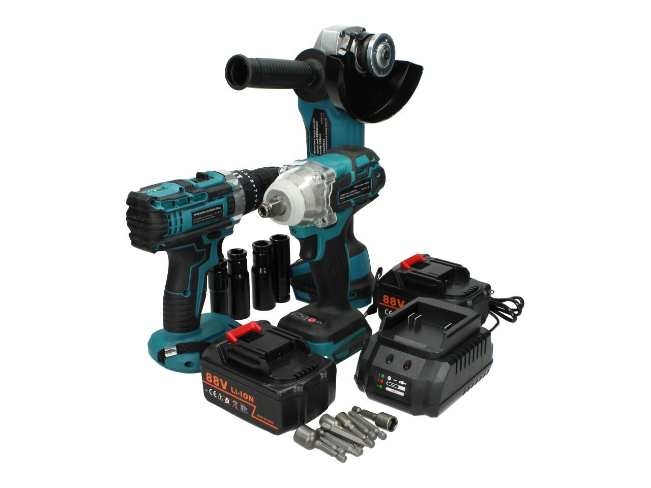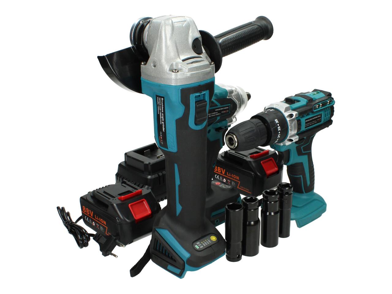 Kvalitní sada Aku nářadí včetně baterií a nabíječky a příslušenství jako ořechy a čroubováky s magnetem. Sada obsahuje aku rázový utahovák, aku vrtačku s příklepem a utahovák, 2 akumulátory, nabíječku a příslušenství