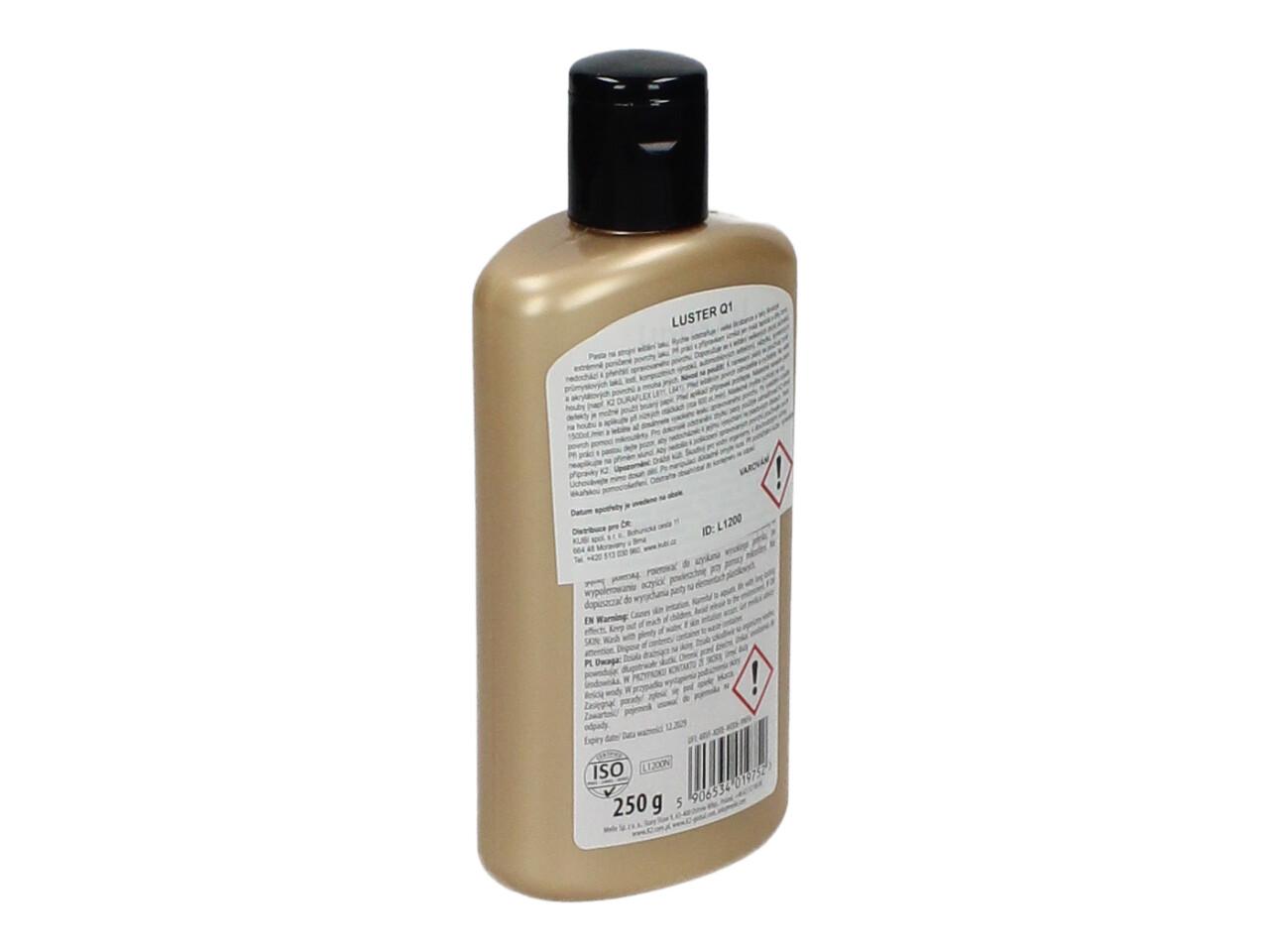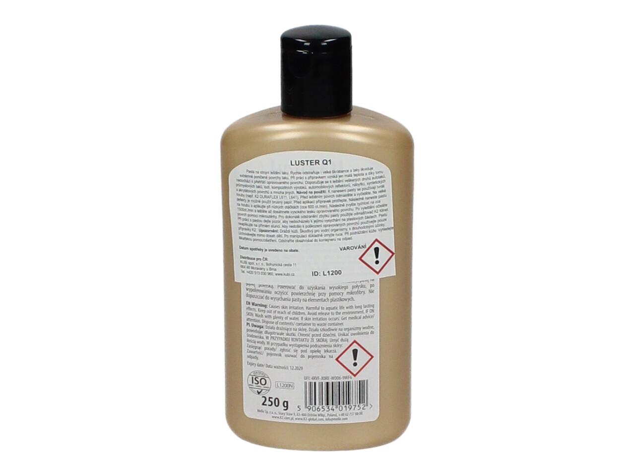 K2 Luster Q1 White 250 g je profesionální brusná leštící pasta na auto a další povrchy. Rychle odstraňuje škrábance, vady a matná místa z poškozeného laku a vrací povrchu dokonalý lesk. Díky nízké tvorbě tepla je bezpečná pro všechny typy automobilových i průmyslových laků.