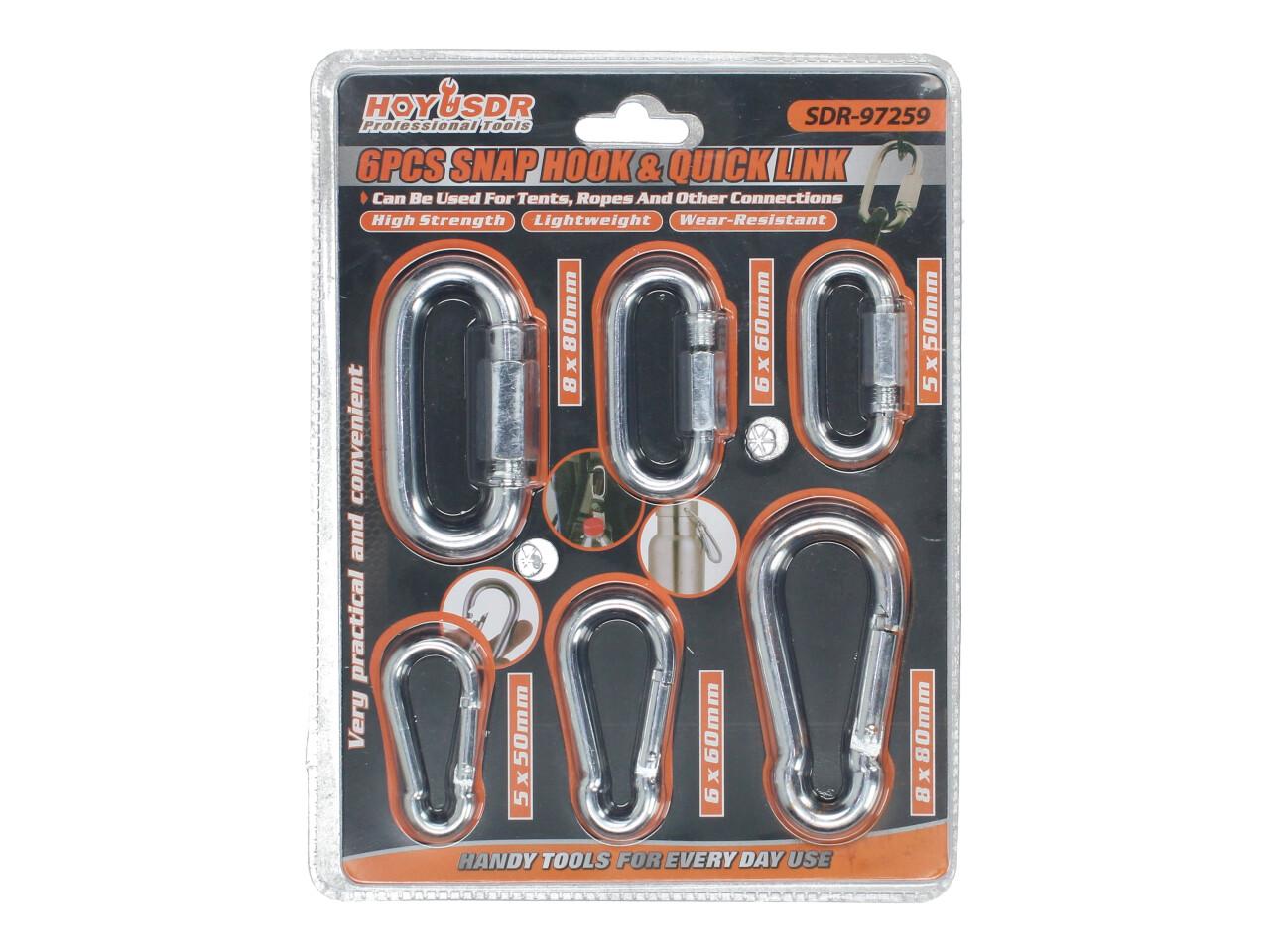 Praktická sada 6 univerzálních kovových karabin různých velikostí, které najdou široké využití doma, v dílně, při kempování i na cestách. Karabiny jsou ideální pro připevnění klíčů, lahví, lan, batohů, vybavení ke stanu nebo dalších drobných předmětů, které potřebujete mít vždy po ruce.